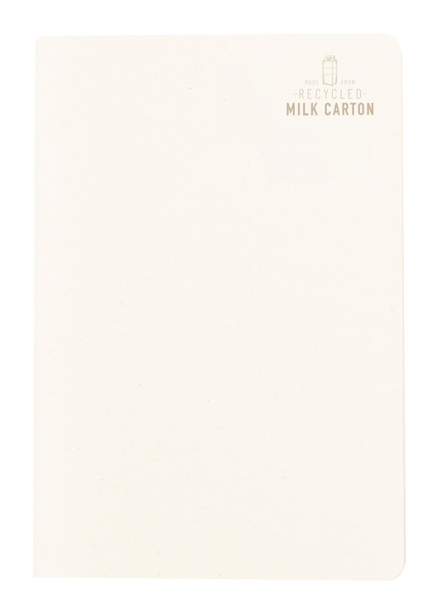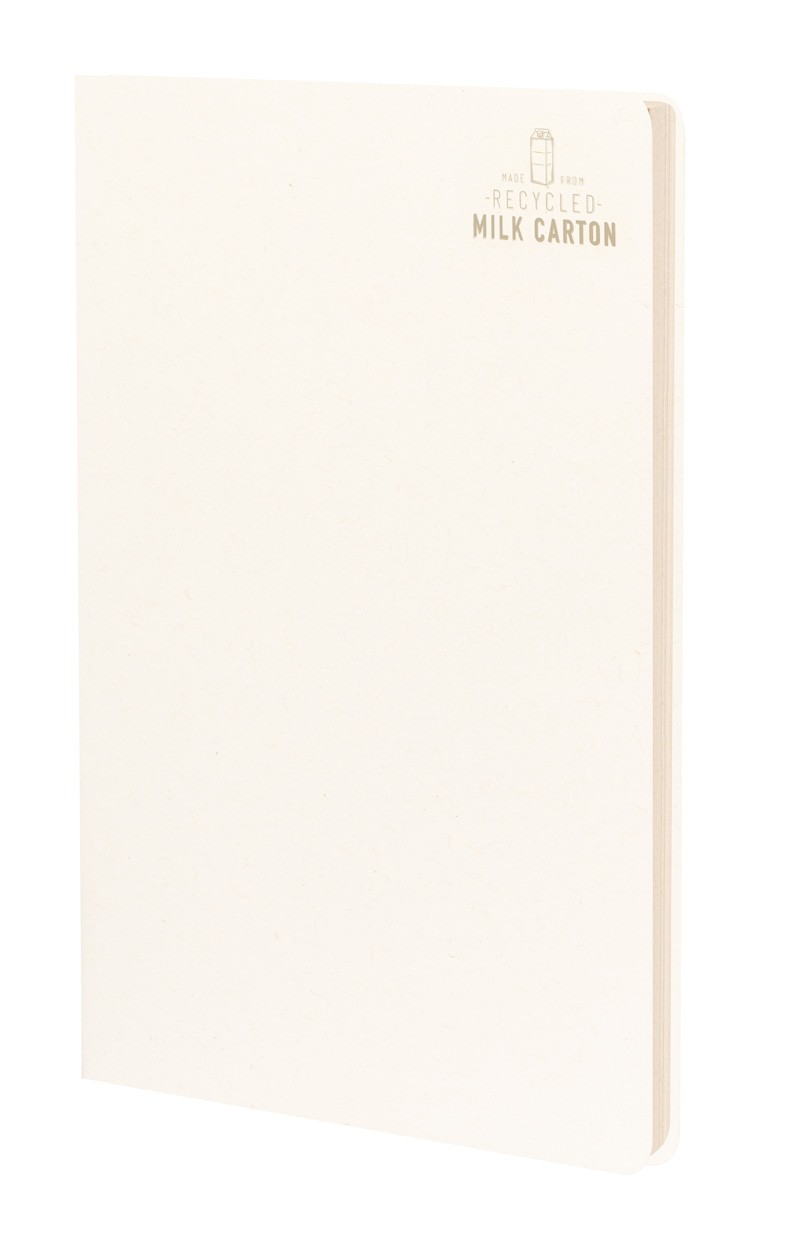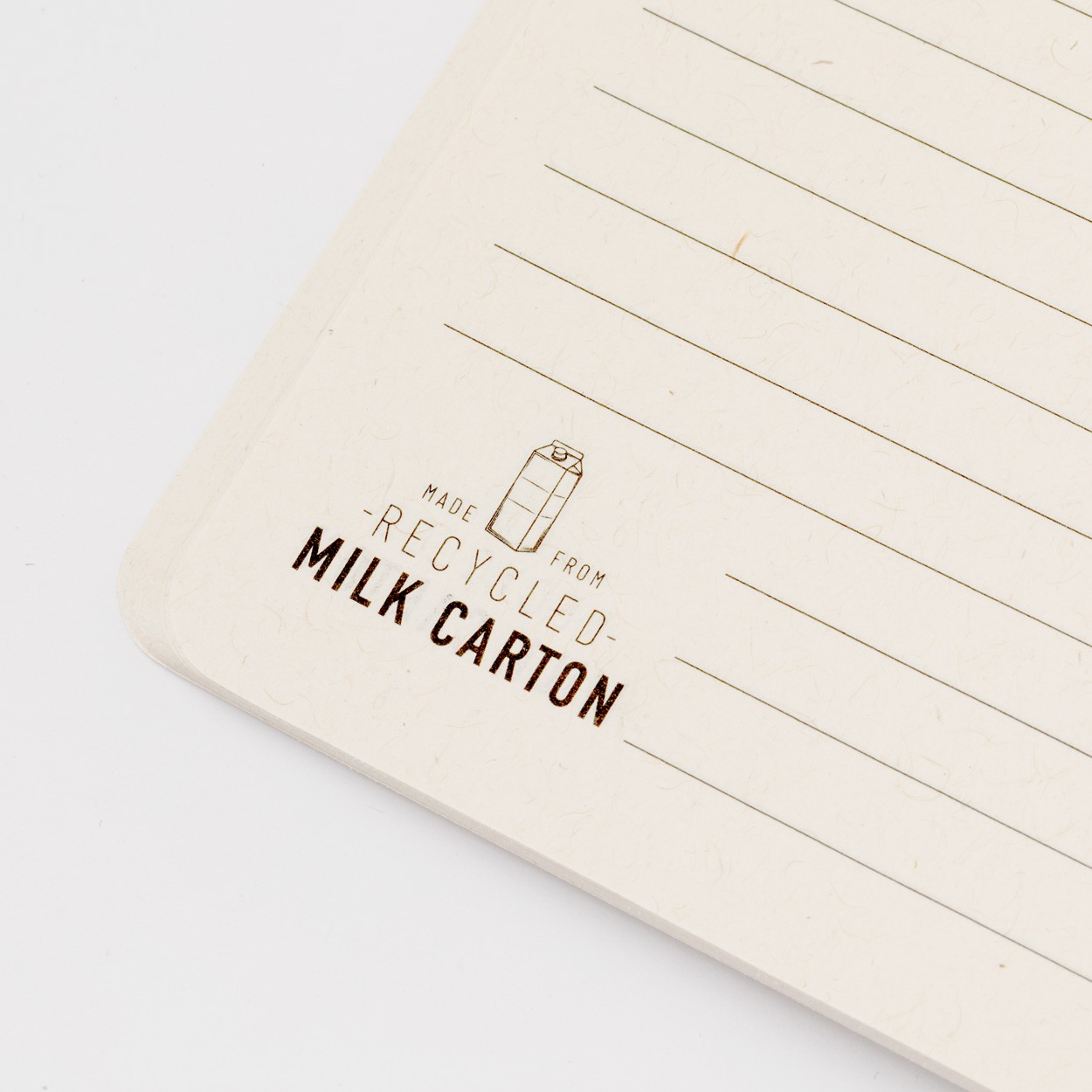 Recycled milk carton covered notebook with 60 lined sheets, A5 size.