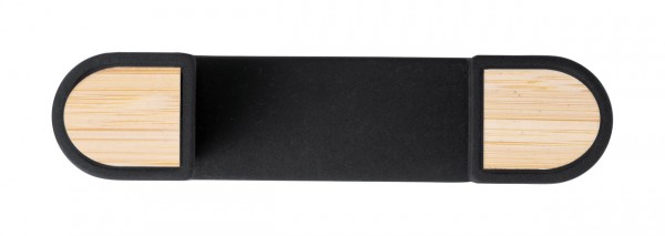 Adjustable car mobile holder with bamboo details and air vent mounting.