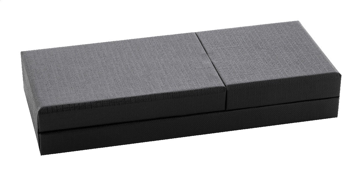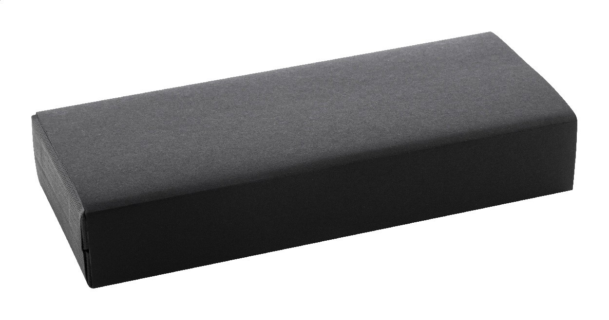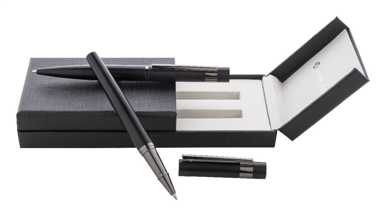 Set elegant de pix și roller, din metal, cu detalii metalice strălucitoare. În cutie cadou de culoare asortată, cu mină albastră. Produs marca André Philippe.