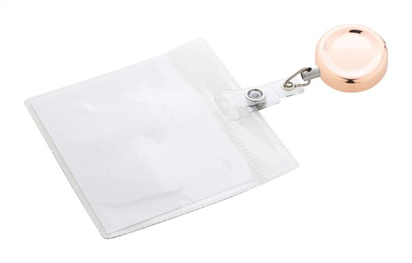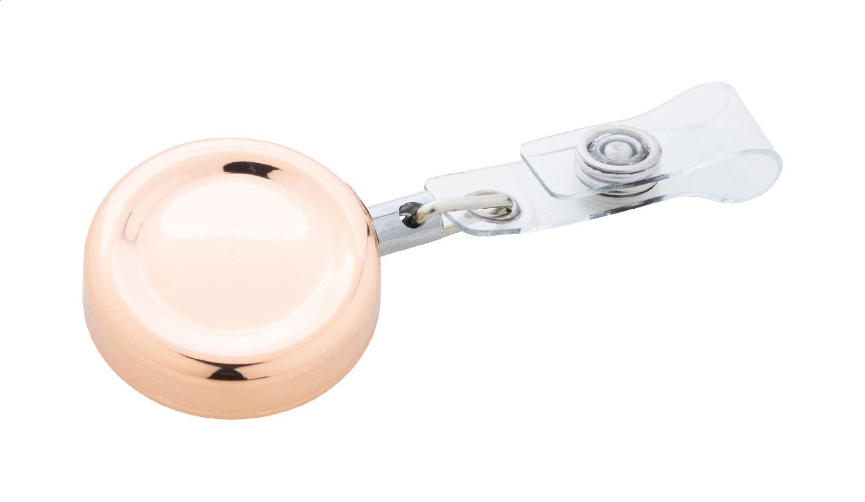 Suport metalic pentru insignă, cu finisaj metalic lucios. Cu închidere cu capsă, fir telescopic și clemă metalică.
