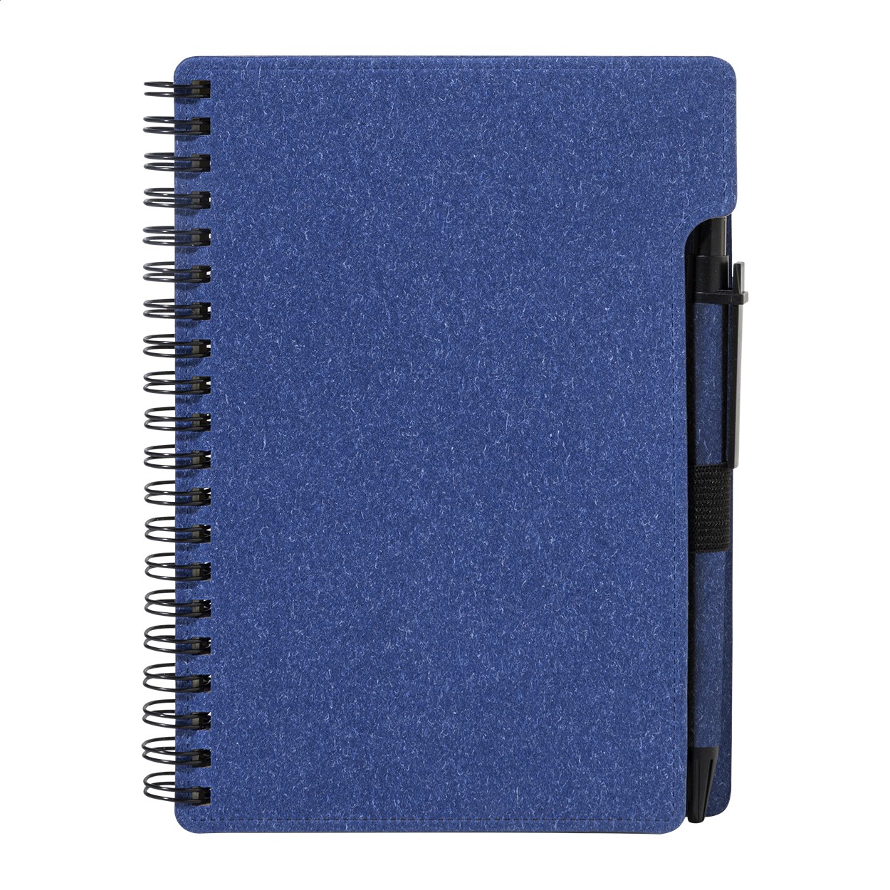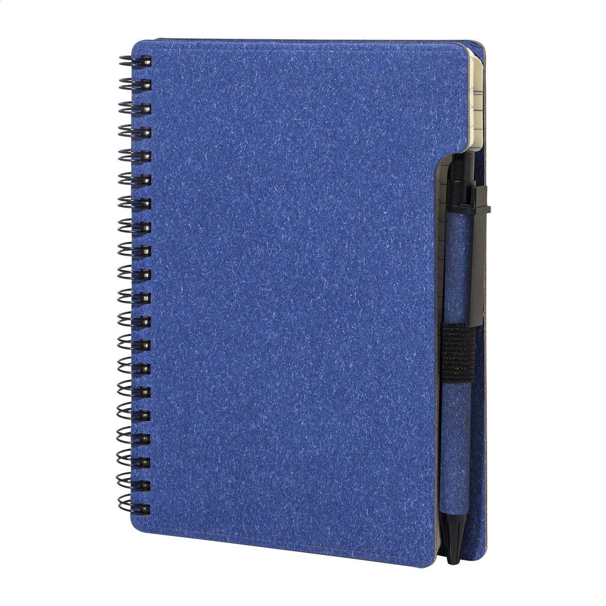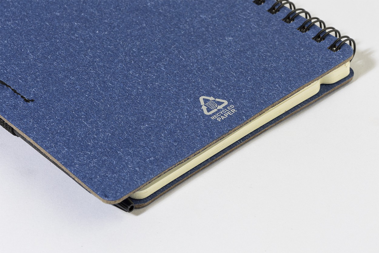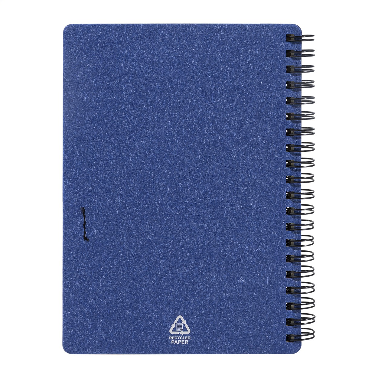 Caiet cu spirală, din hârtie reciclată, cu 80 de file dictando. Format A6. Include hârtie reciclată și pix din PP reciclat cu mină albastră.