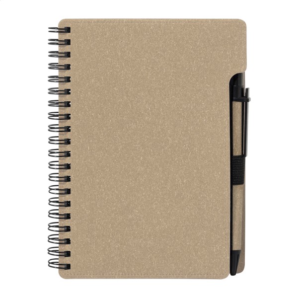Caiet cu spirală, din hârtie reciclată, cu 80 de file dictando. Format A6. Include hârtie reciclată și pix din PP reciclat cu mină albastră.