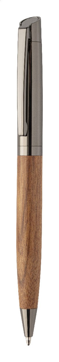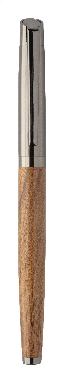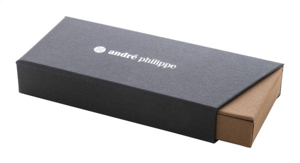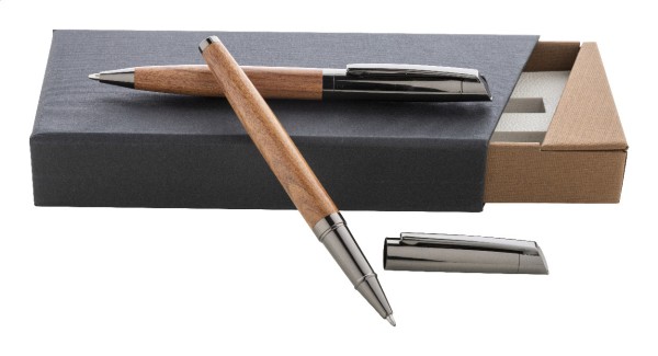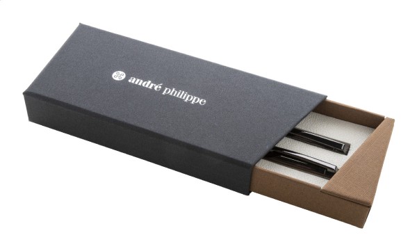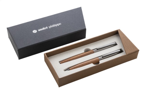Set elegant de pix și roller din metal, cu corp din lemn și detalii metalice strălucitoare. În cutie cadou în două culori, cu mină albastră. Produs marca André Philippe.