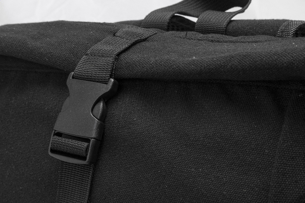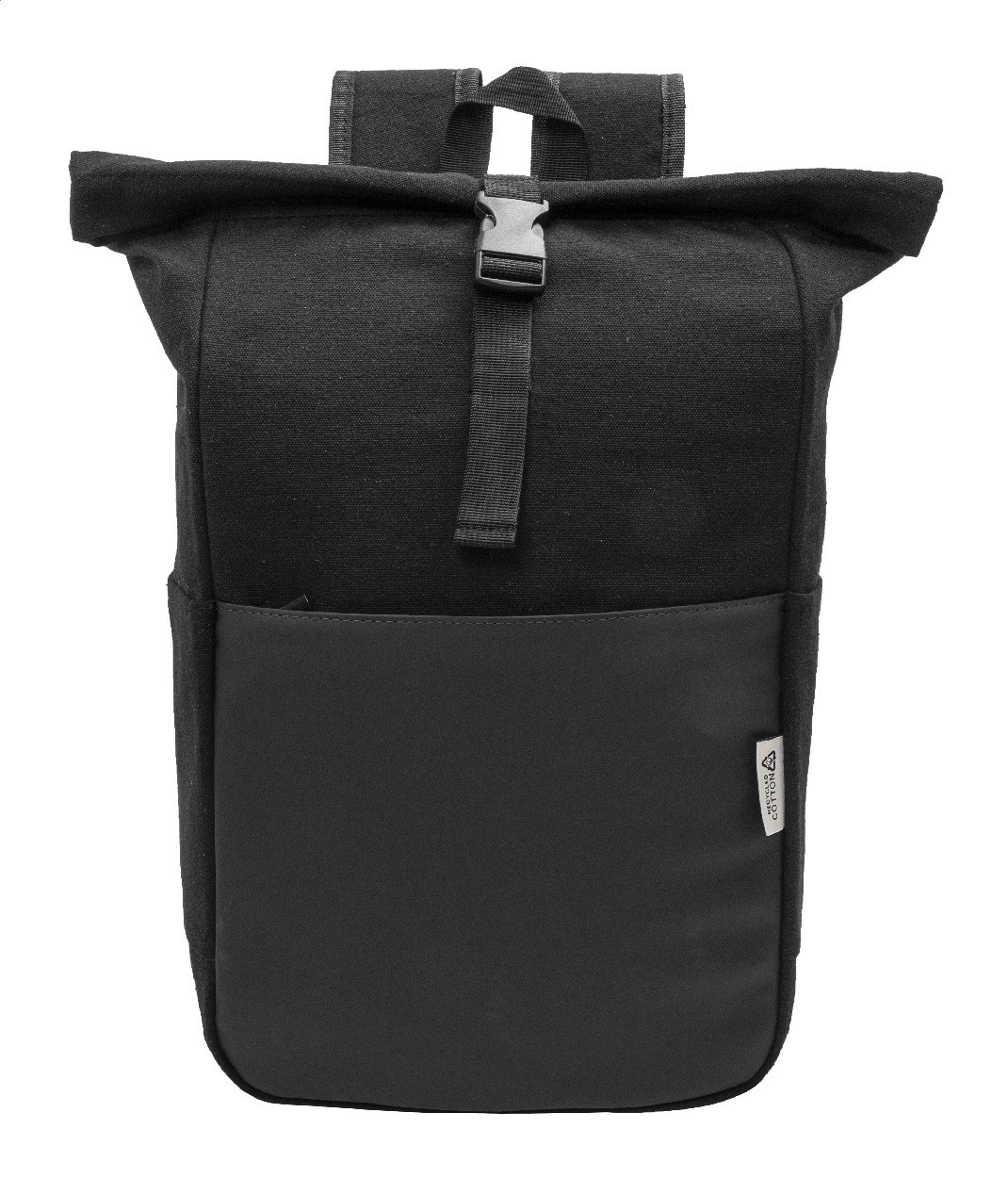 Rucsac roll-top din pânză reciclată, cu închidere cu cataramă și buzunar frontal cu fermoar, din piele PU reciclată moale. Cu compartiment căptușit pentru laptop (15"), buzunare laterale, spate și bretele de umăr căptușite. 70% bumbac reciclat și 30% poliester RPET. Cu etichetă distinctivă din bumbac reciclat.