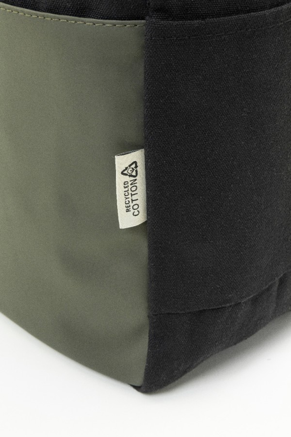 Rucsac roll-top din pânză reciclată, cu închidere cu cataramă și buzunar frontal cu fermoar, din piele PU reciclată moale. Cu compartiment căptușit pentru laptop (15"), buzunare laterale, spate și bretele de umăr căptușite. 70% bumbac reciclat și 30% poliester RPET. Cu etichetă distinctivă din bumbac reciclat.