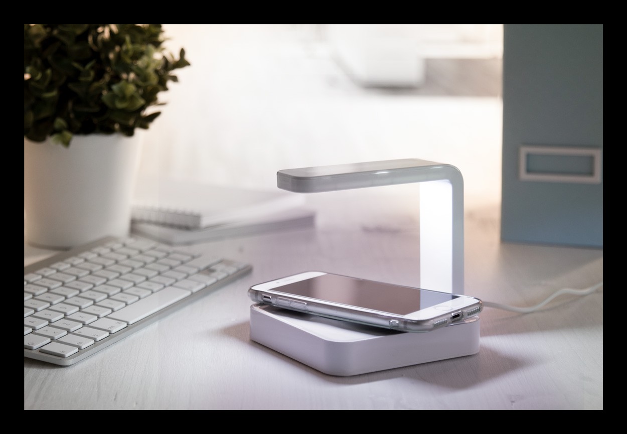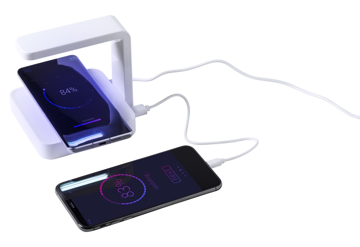 Incarcator wireless rapid din plastic, cu sterilizator UV. Putere max.: 2000 mA. Cu port USB pentru incarcarea a 2 dispozitive simultan (1 fara fir si 1 prin cablu). Cablu de incarcator USB inclus.