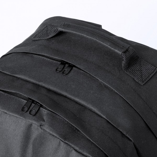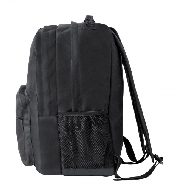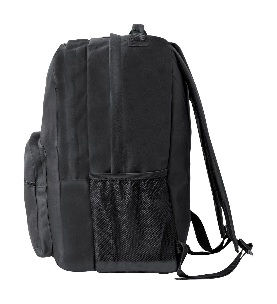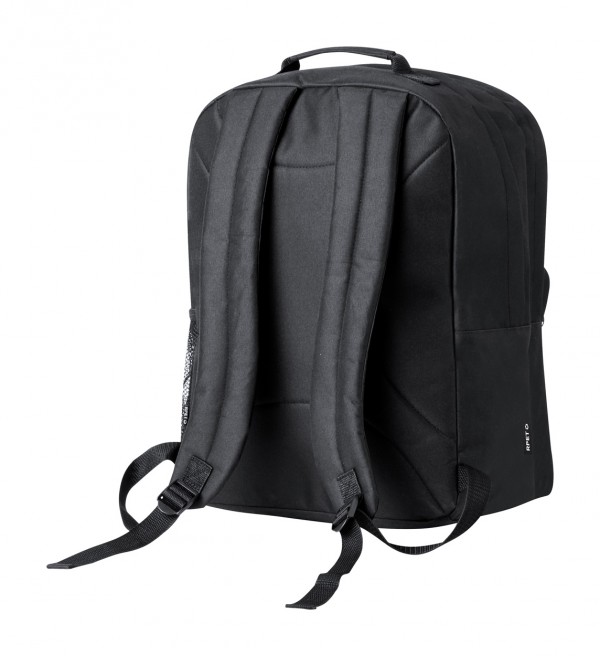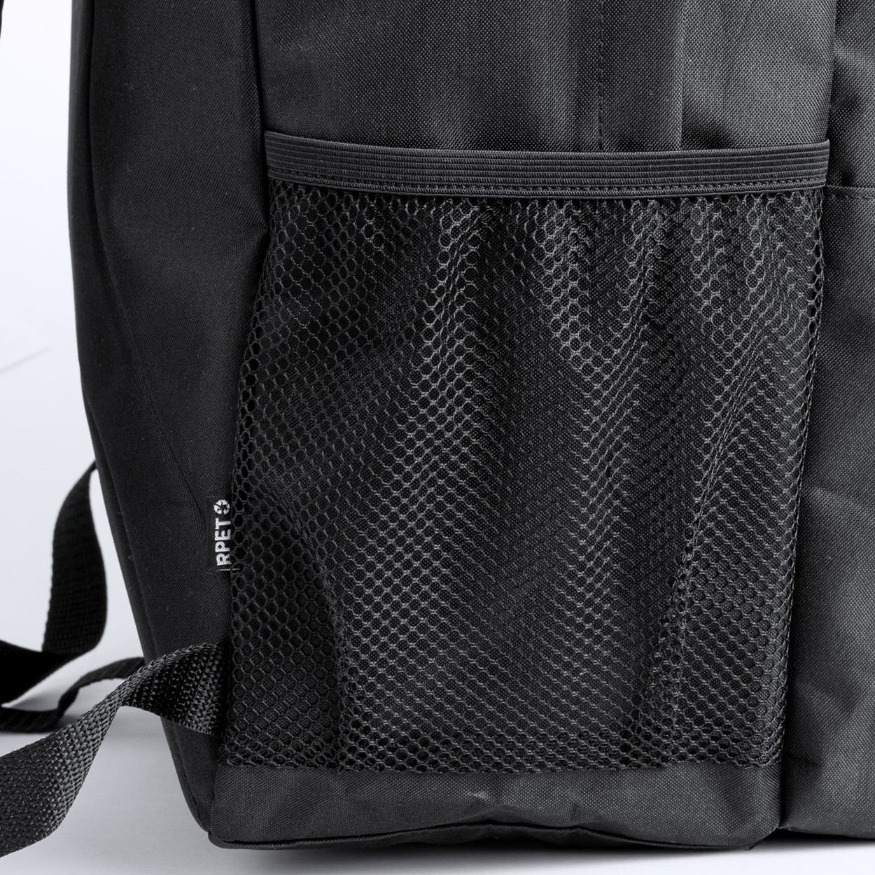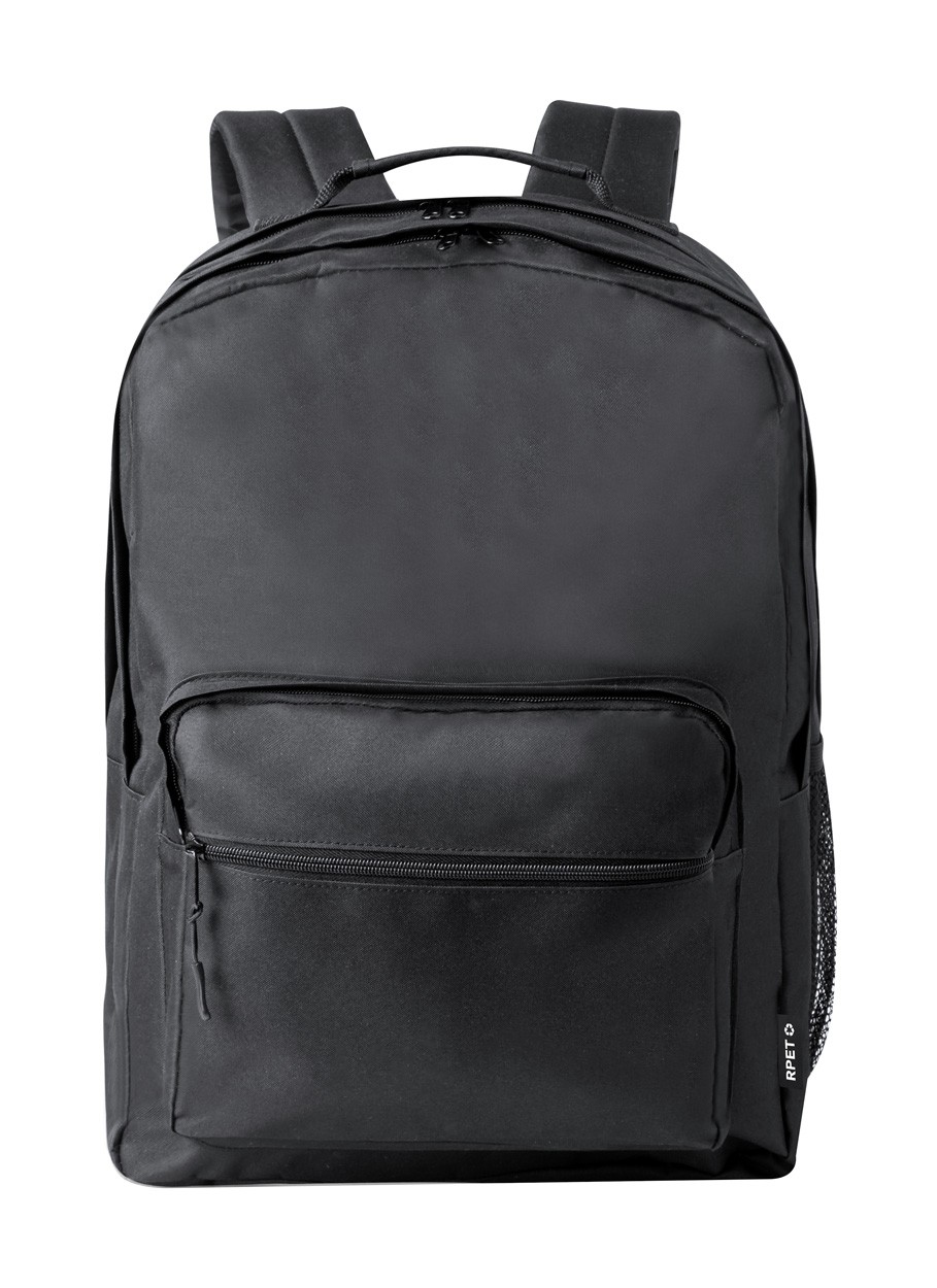 RPET backpack with zipped compartments, padded laptop (15") compartment, side mesh pockets, padded back and shoulder straps. 600D RPET polyester with distinctive RPET label.