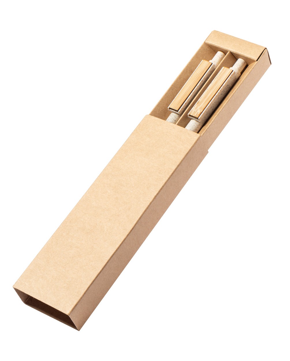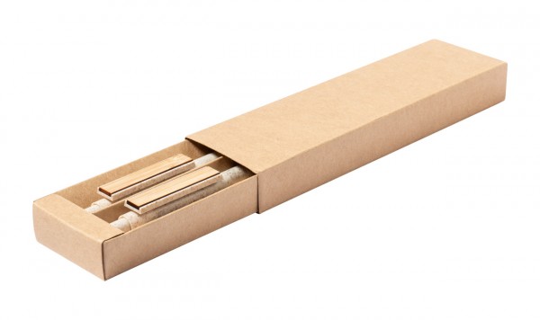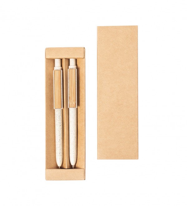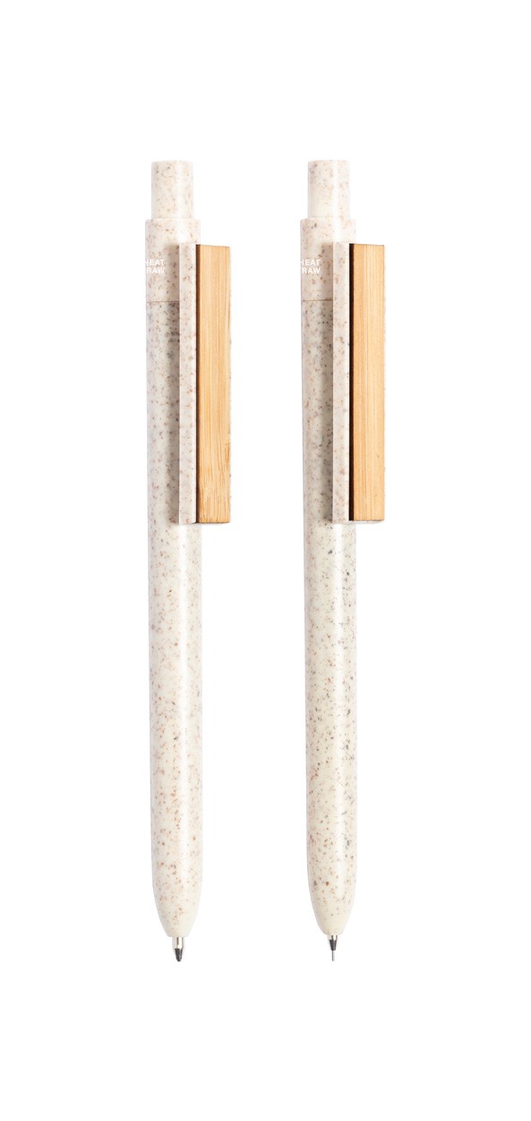 Set pix din plastic din paie de grâu cu pix și creion mecanic cu clemă de bambus în cutie de hârtie reciclată. Cu reumplere albastră și mine de 0,5 mm.