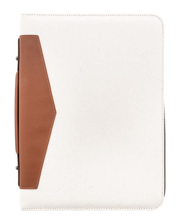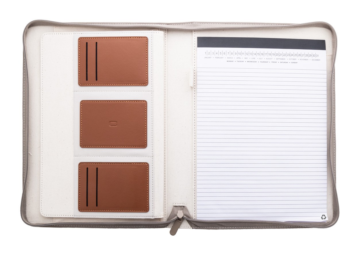 Dosar pentru documente de dimensiune A4, din pânză și piele PU reciclată, cu fermoar, cu mâner de transport și mai multe buzunare interioare pentru organizare. Cu blocnotes cu 20 de foi dictando din hârtie reciclată. 70% bumbac reciclat și 30% poliester RPET.