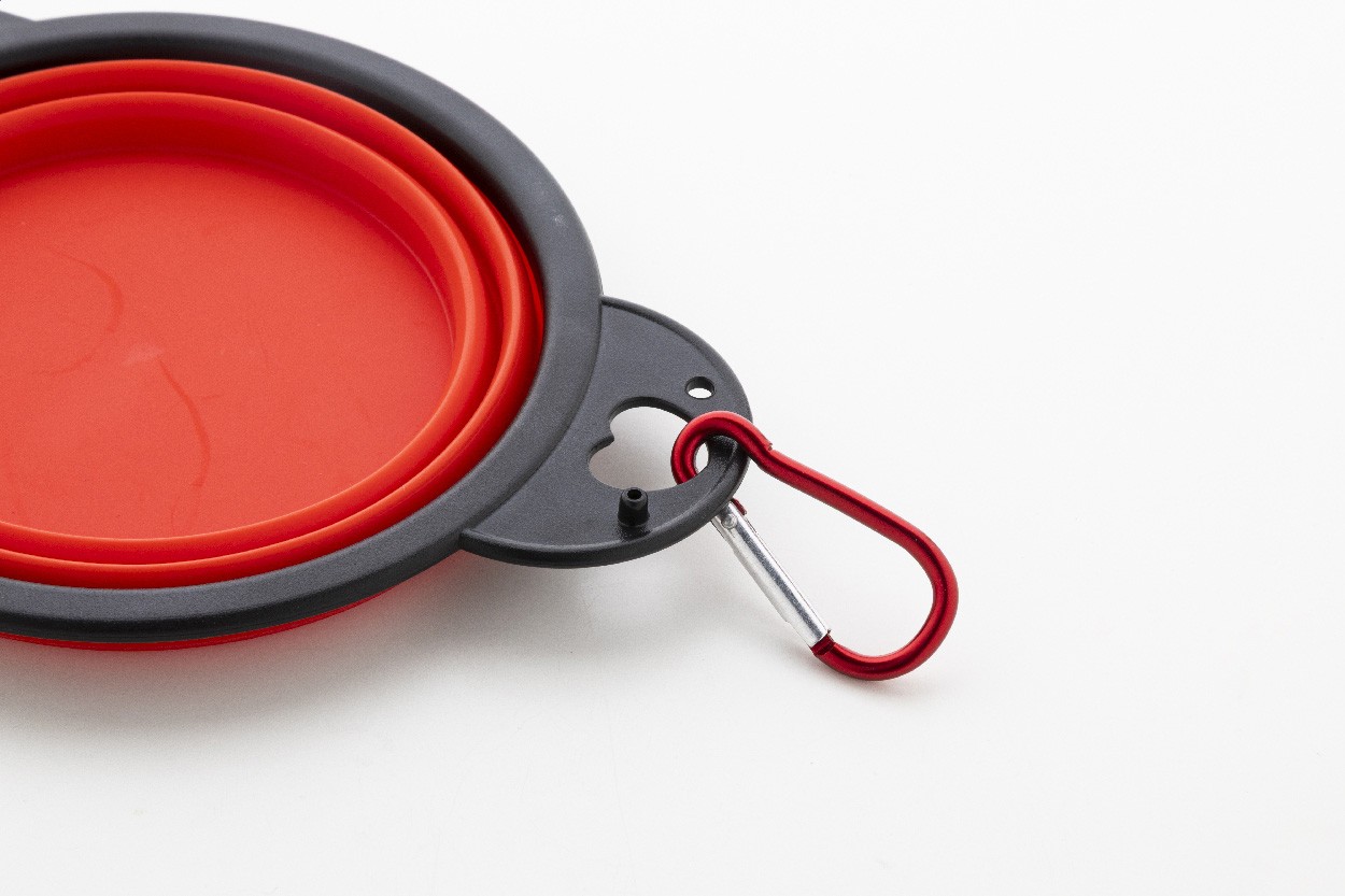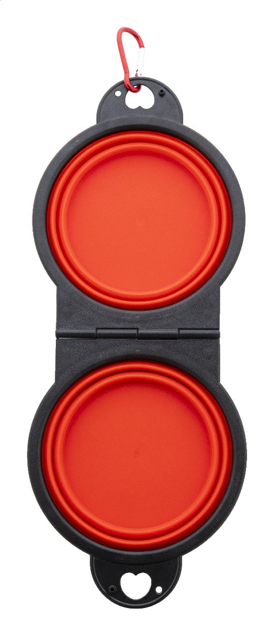 Bol pliabil pentru animale de companie, din TPE durabil, cu două compartimente de 450 ml și carabină din aluminiu de culoare asortată.