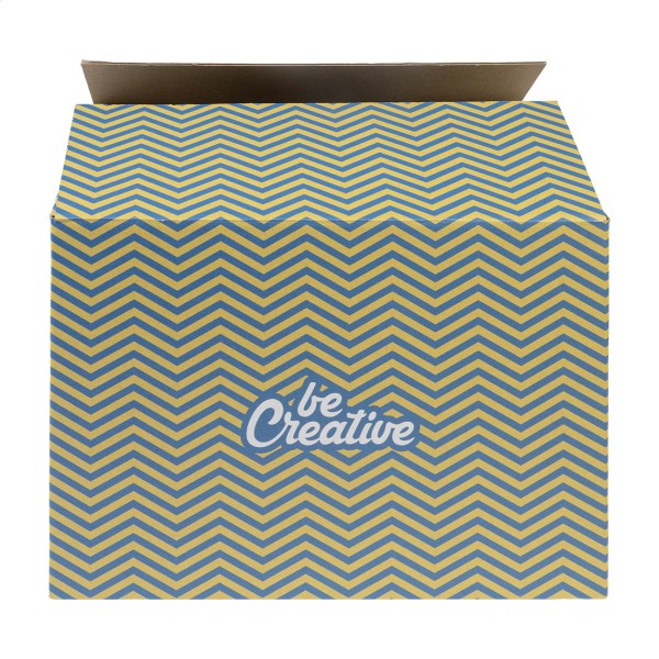 Cutie de transport, din carton ondulat, personalizată, imprimată full colour. Livrată în pachet plat, partea superioară și inferioară trebuie lipite cu bandă adezivă pentru a putea fi utilizată. Cantitate minimă de comandă: 50 bucăți.