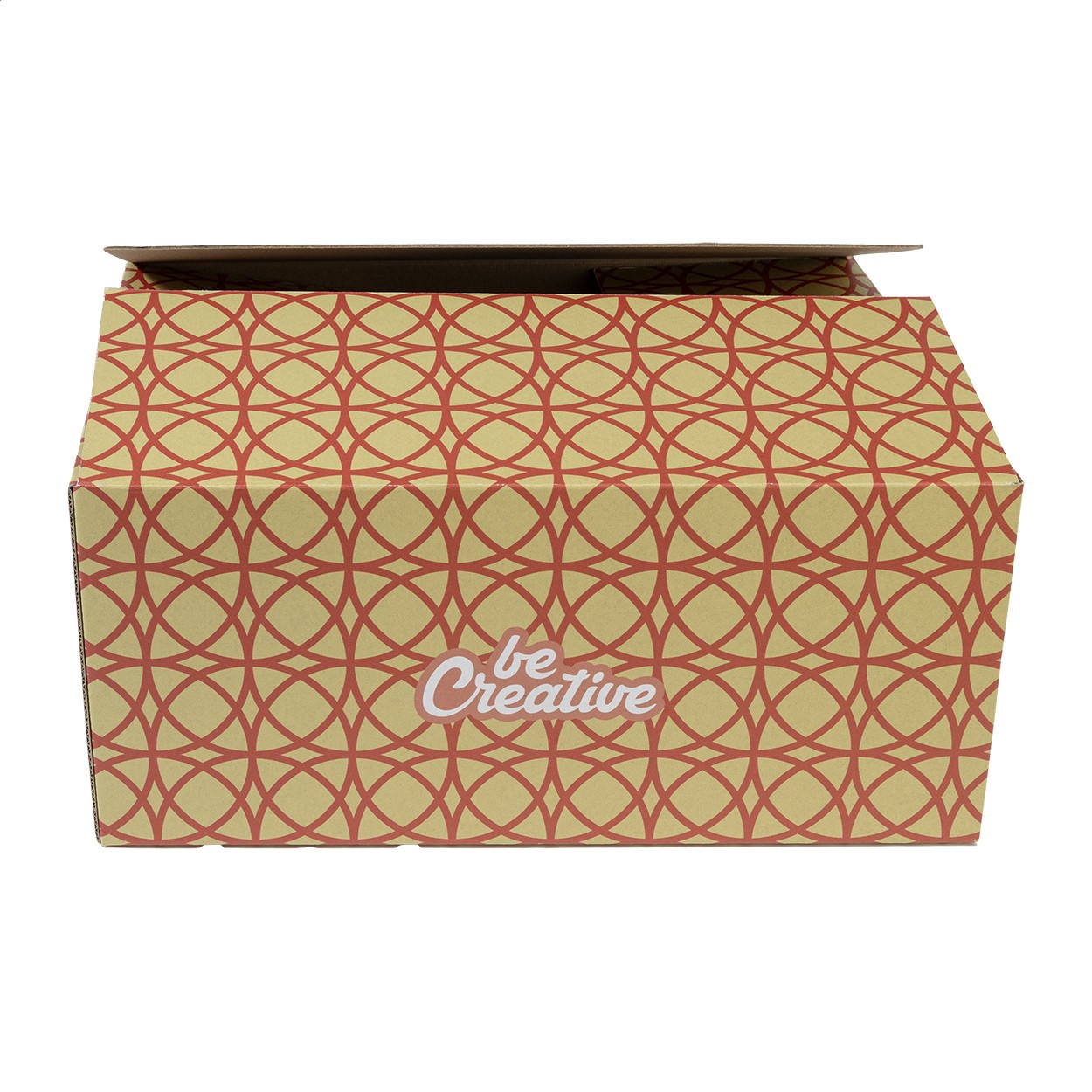 Cutie de transport, din carton ondulat, personalizată, imprimată full colour. Livrată în pachet plat, partea superioară și inferioară trebuie lipite cu bandă adezivă pentru a putea fi utilizată. Cantitate minimă de comandă: 50 bucăți.