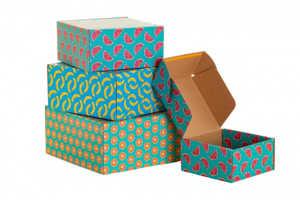 Cutie de cadouri poștală, confecționată la comandă, din carton ondulat tipărit color, pe bază pătrată cu bandă de auto-etanșare. Livrat ambalat plat. MOQ: 50 buc.