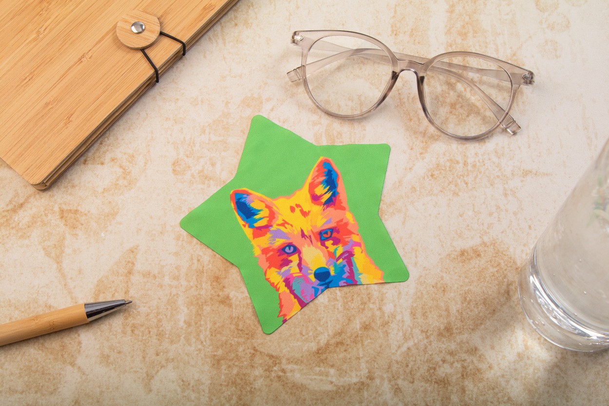 Lavetă de curățat, din microfibră RPET (170 g/m²) pentru ochelari și ecrane, realizată la comandă. Produs într-o formă unică cu design imprimat prin sublimare. MOQ: 100 buc.