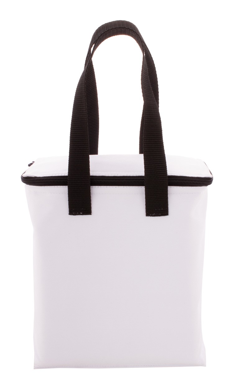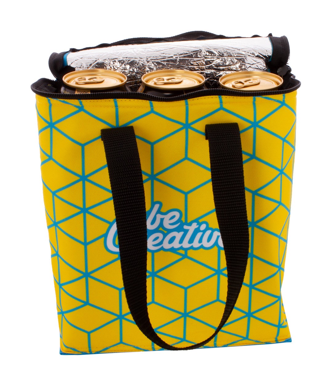 Geantă frigorifică, personalizată, cu fermoar, din poliester 600D RPET, cu căptușeală din aluminiu, pentru 6 bucăți cutii de 0,33 L. Cu grafică imprimată prin sublimare și etichetă RPET distinctivă. MOQ: 25 buc.