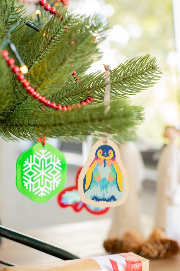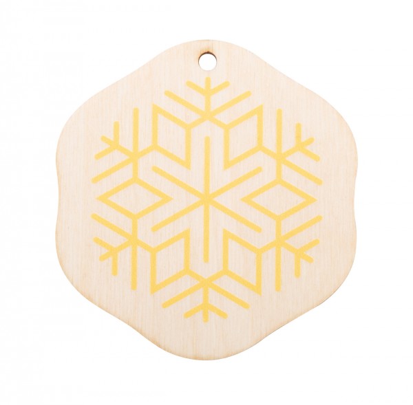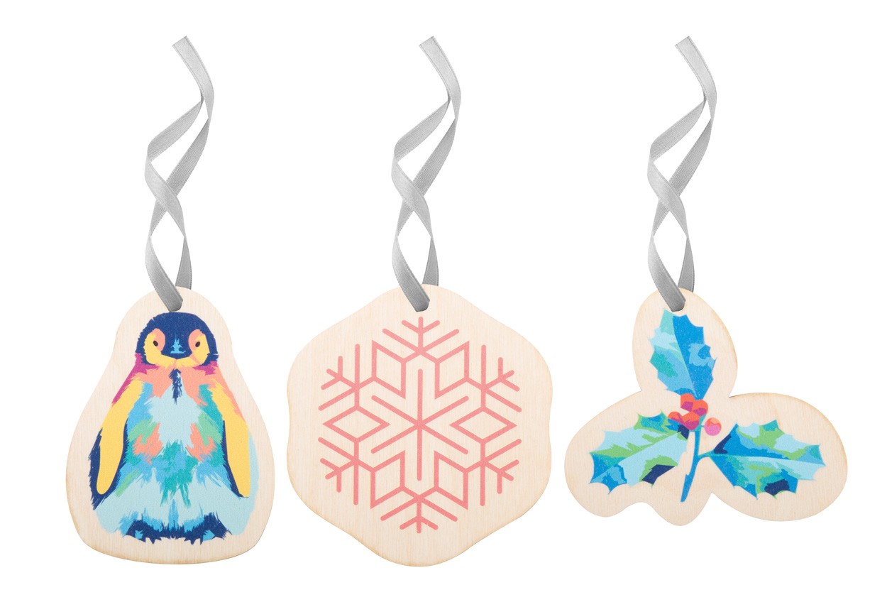 Ornament pentru brad de Crăciun, realizat la comandă din placaj de mesteacăn, cu formă personalizată și grafică plină de culoare. Dimensiune maxima: 80x80 mm. Pretul include imprimarea UV LED pe o parte. Livrat cu panglică detașată. MOQ: 100 buc.