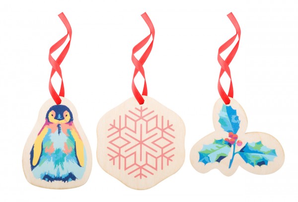 Ornament pentru brad de Crăciun, realizat la comandă din placaj de mesteacăn, cu formă personalizată și grafică plină de culoare. Dimensiune maxima: 80x80 mm. Pretul include imprimarea UV LED pe o parte. Livrat cu panglică detașată. MOQ: 100 buc.