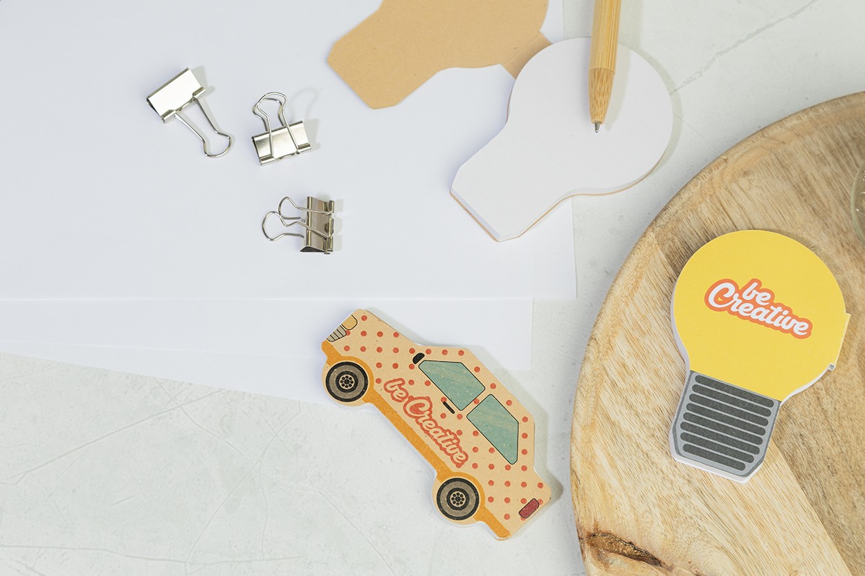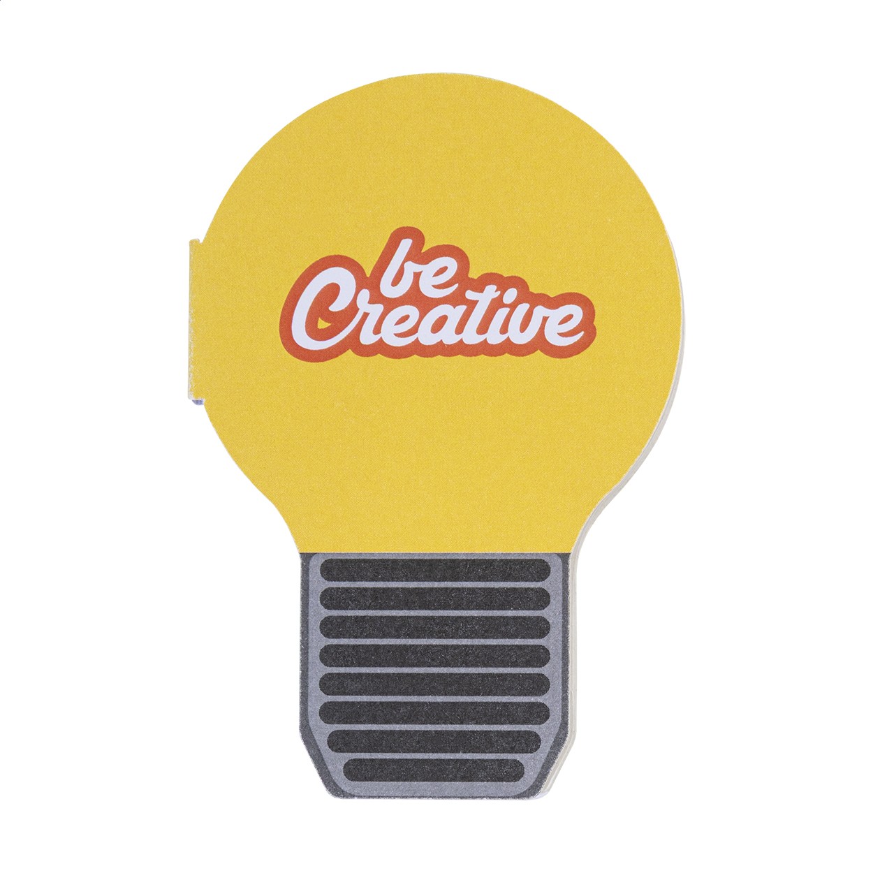 Carnet adeziv personalizat, în formă de bec, acoperit cu hârtie. Include 50 de foi de hârtie reciclată adezivă. Prețul include coperta exterioară imprimată color. Cantitate minimă de comandă: 100 bucăți.