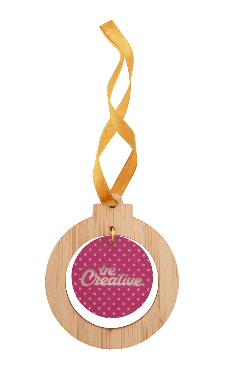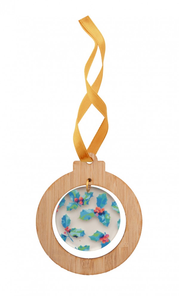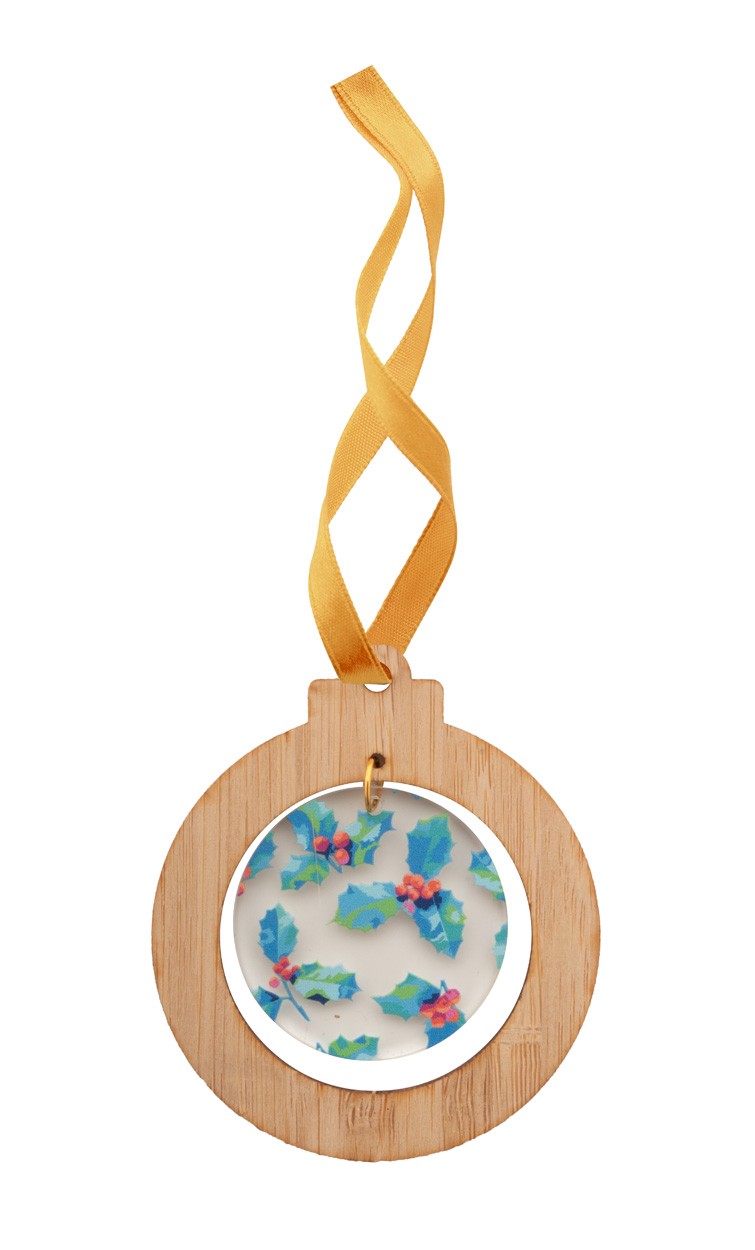 Ornament de brad din placaj de bambus si material acrilic cu panglica aurie. Pretul include imprimarea full colourr pe partea acrilica. Cantitate minima de comanda 100 buc.