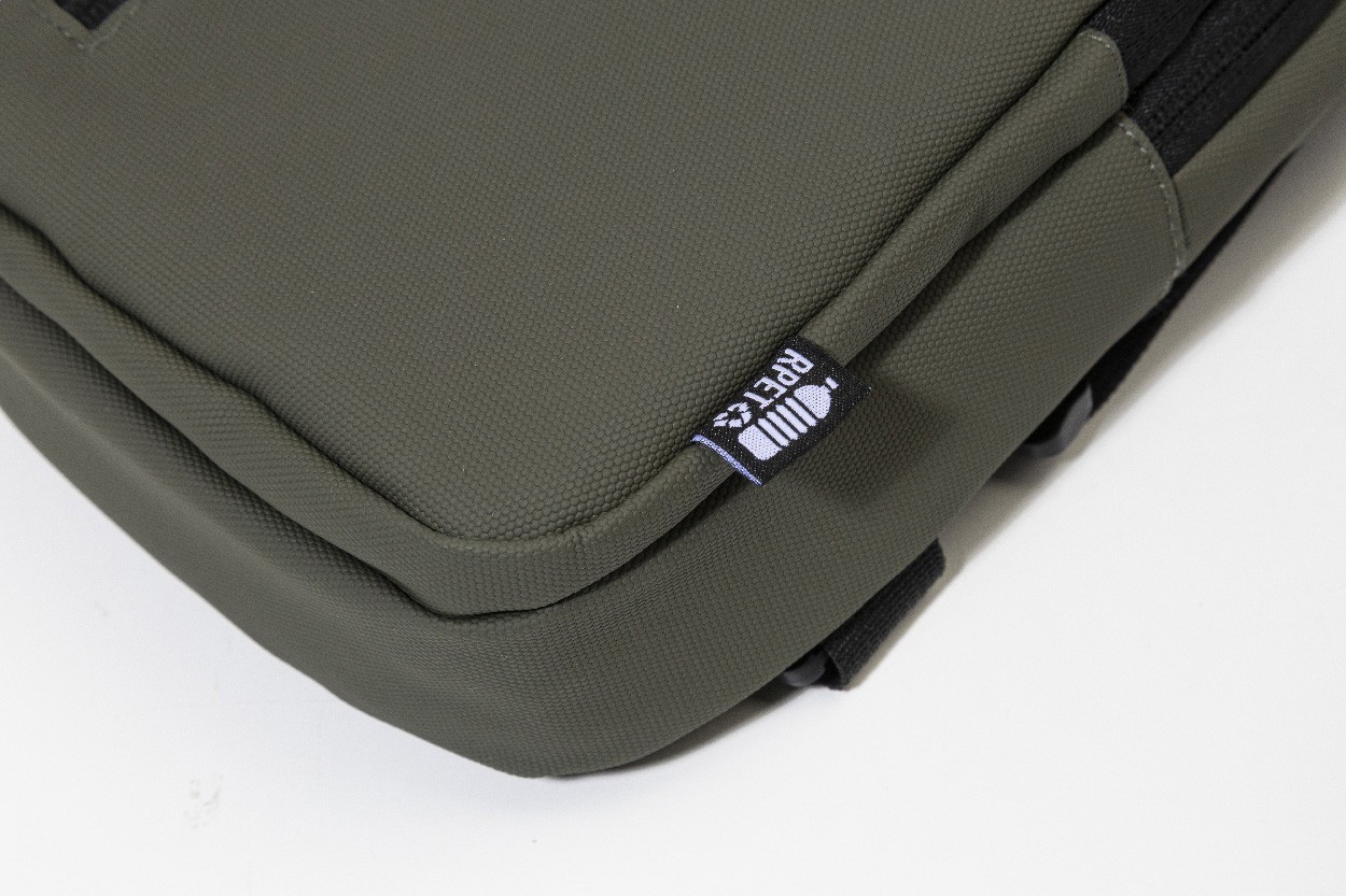 Geantă crossbody impermeabilă, din RPET, cu buzunare cu fermoar, închidere cu cataramă și spate căptușit. Cu curea de umăr reglabilă, cu poziții laterale stânga și dreapta. Poliester RPET 600D acoperit cu PU, cu etichetă distinctivă RPET.