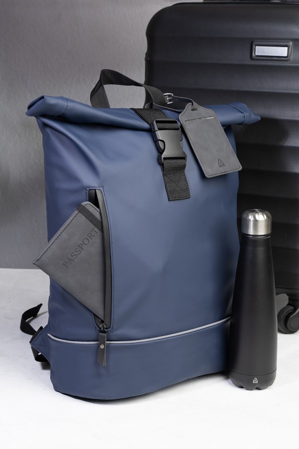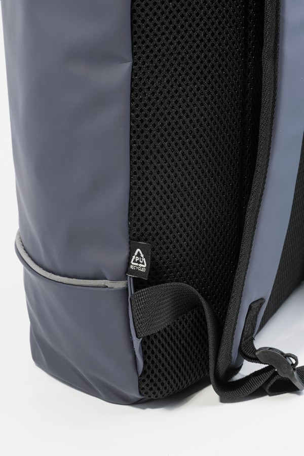 Rucsac impermeabil, moale, din piele PU reciclată, cu compartiment principal cu fermoar și închidere cu cataramă, buzunar frontal cu fermoar impermeabil, compartiment căptușit pentru laptop (15") și bandă reflectorizantă. Cu spate și bretele căptușite. Cu etichetă distinctivă din PU reciclat.