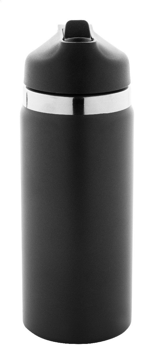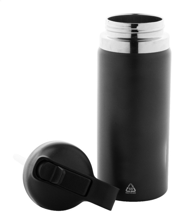Sticlă termică, cu perete dublu, din oțel inoxidabil reciclat, cu capac rabatabil din PP, mâner de transport și pai integrat. 500 ml.