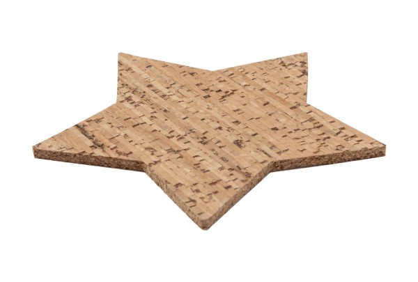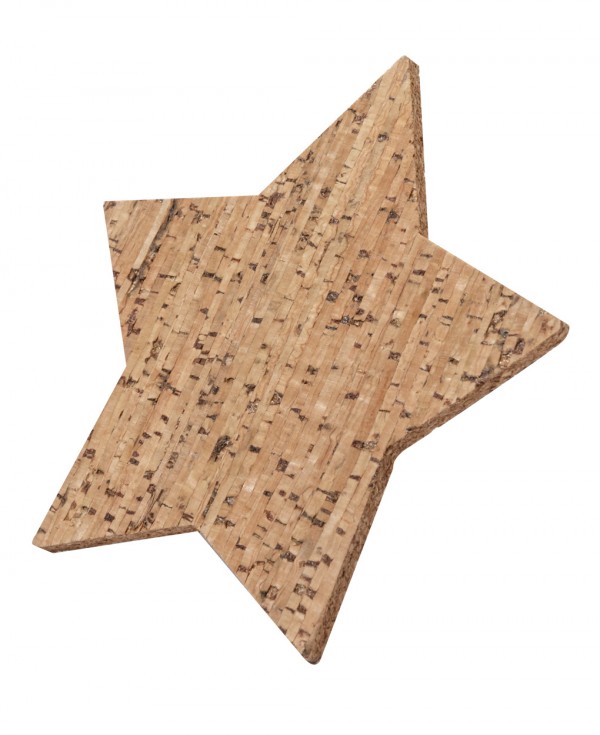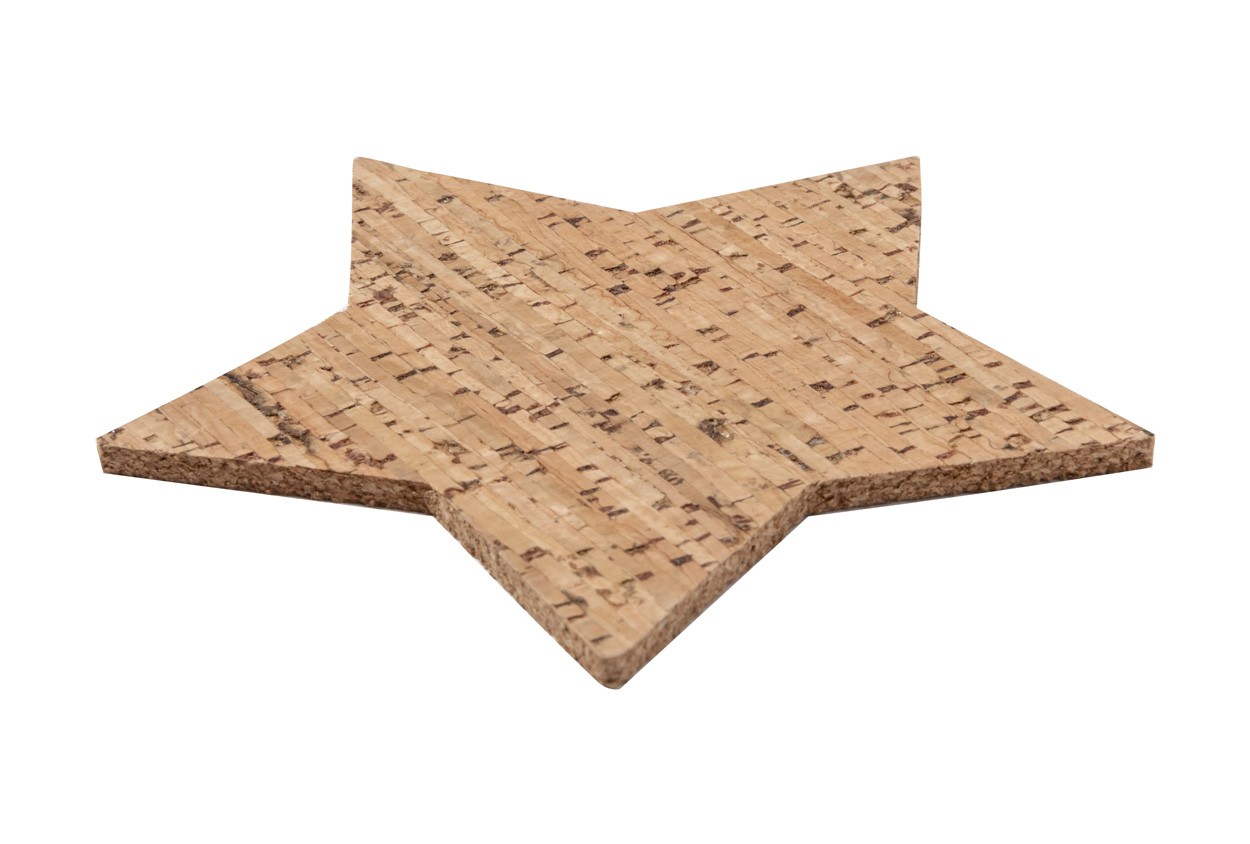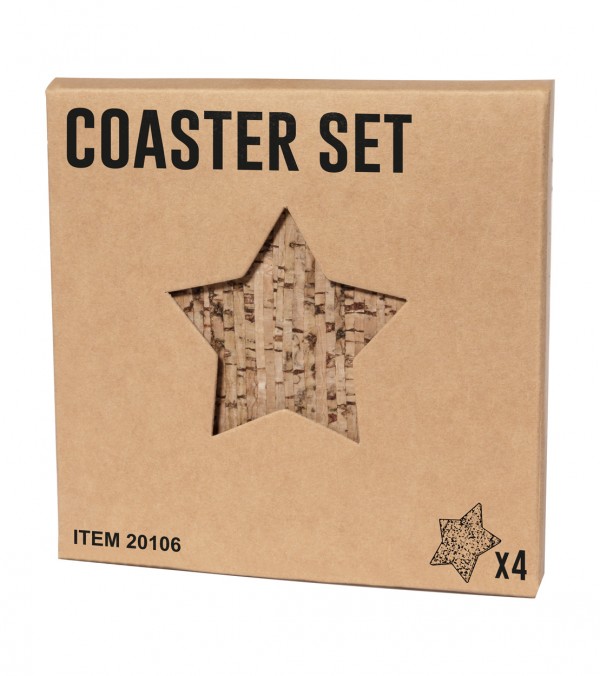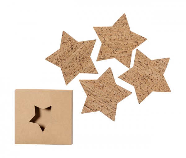 Set de 4 bucăți coaster, în formă de stea, din plută naturală. În cutie de hârtie kraft.