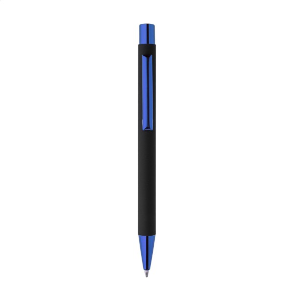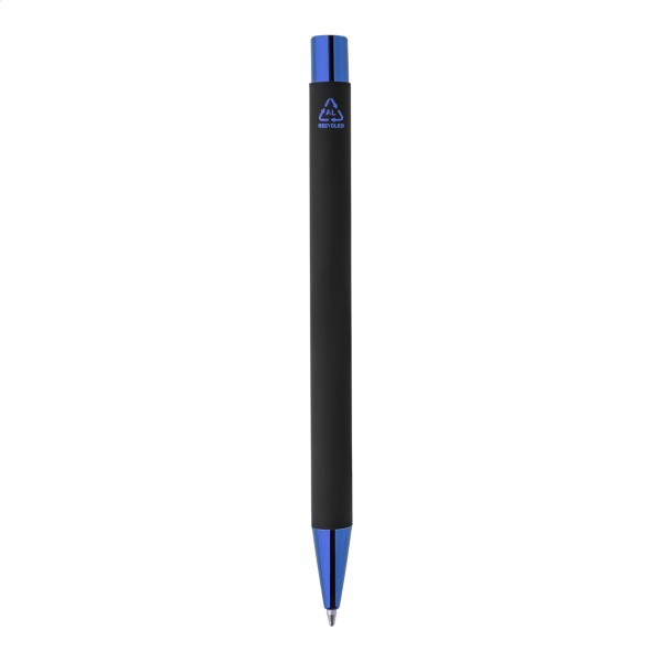 Pix din aluminiu reciclat, cu corp cauciucat negru și părți metalice colorate, cu finisaj lucios. Cu acoperire specială pentru gravură în oglindă, asortată cu părțile metalice. Cu mină albastră.