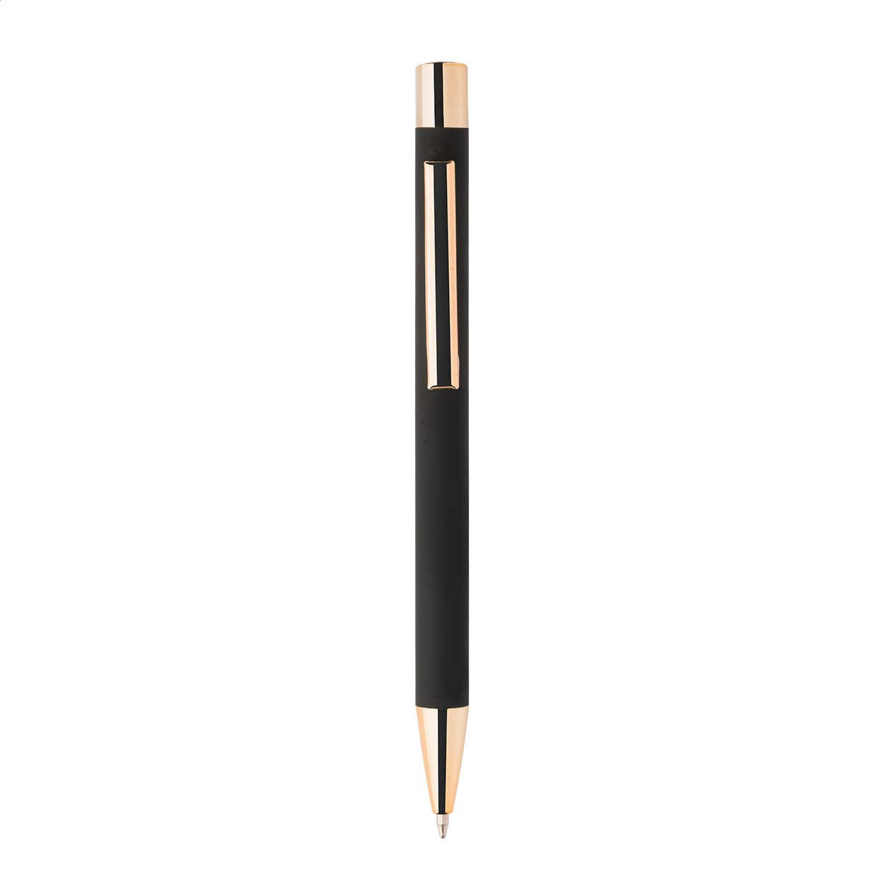 Pix din aluminiu reciclat, cu corp cauciucat negru și părți metalice colorate, cu finisaj lucios. Cu acoperire specială pentru gravură în oglindă, asortată cu părțile metalice. Cu mină albastră.