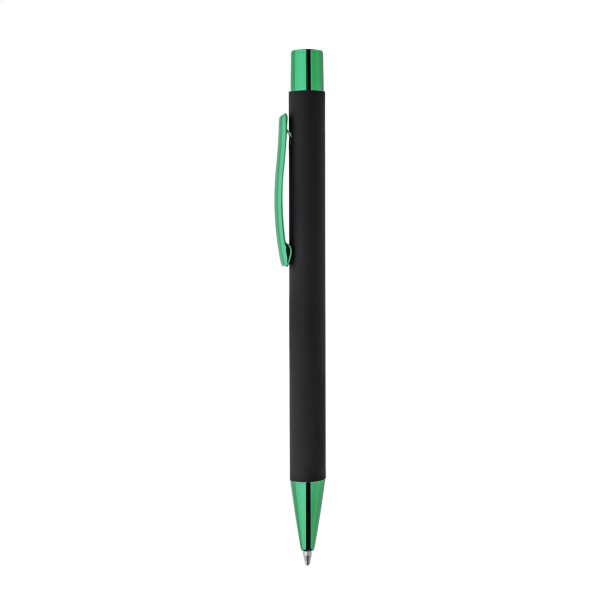 Pix din aluminiu reciclat, cu corp cauciucat negru și părți metalice colorate, cu finisaj lucios. Cu acoperire specială pentru gravură în oglindă, asortată cu părțile metalice. Cu mină albastră.