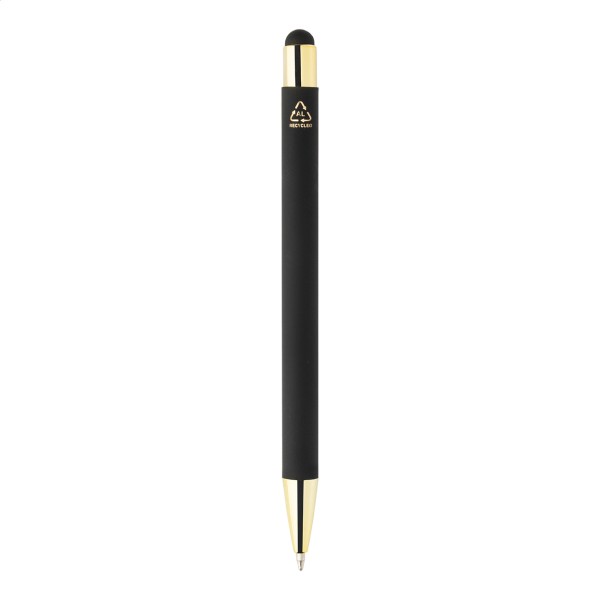 Pix din aluminiu reciclat și stilou cu capăt pentru ecran tactil, cu corp cauciucat negru și părți finisate metalic lucios colorat. Cu acoperire specială pentru gravură oglindă asortată cu părțile metalice. Cu mină albastră.