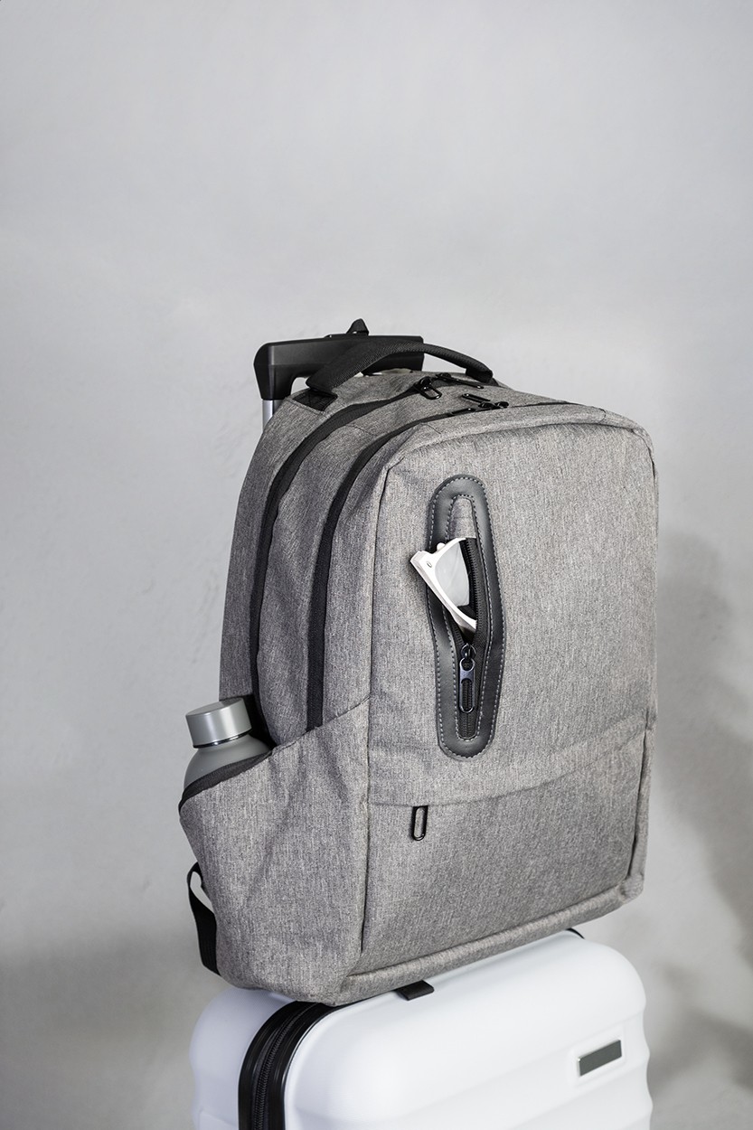 Rucsac RPET, cu compartimente cu fermoar, 2 buzunare frontale cu fermoar, buzunare laterale cu fermoar și compartiment căptușit pentru laptop (15"). Cu spate și curele căptușite, buzunar antifurt și curea pentru troler. Din poliester RPET 300D, cu etichetă RPET distinctivă.