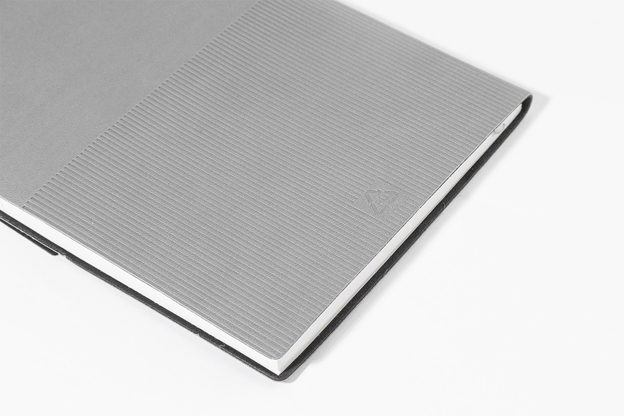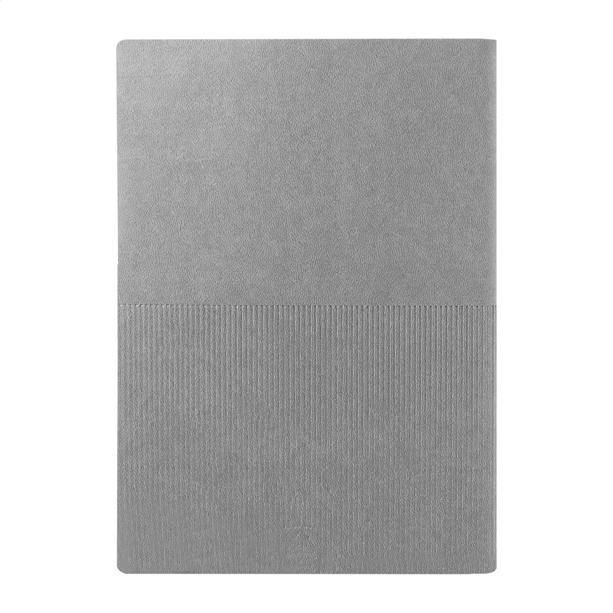 Caiet cu copertă din piele PU reciclată, cu decor în dungi și placă metalică cu logo. Cu semn de carte și 80 de file dictando din hârtie reciclată. Dimensiune A5.