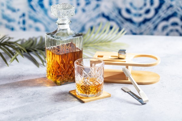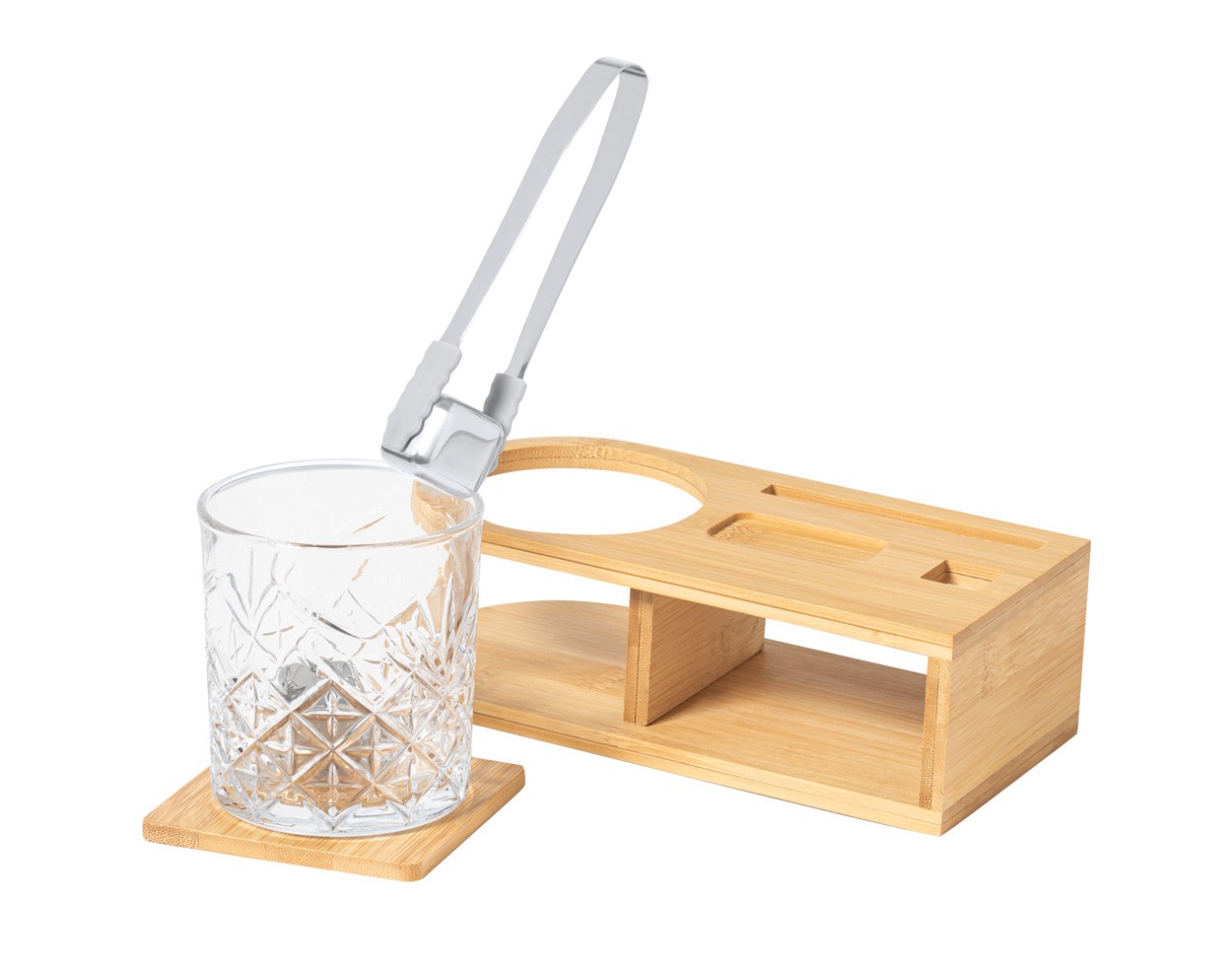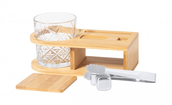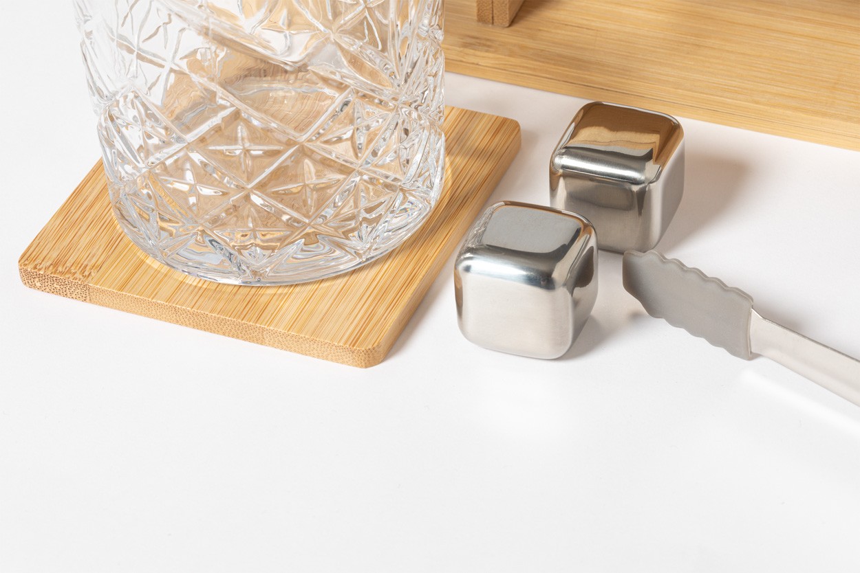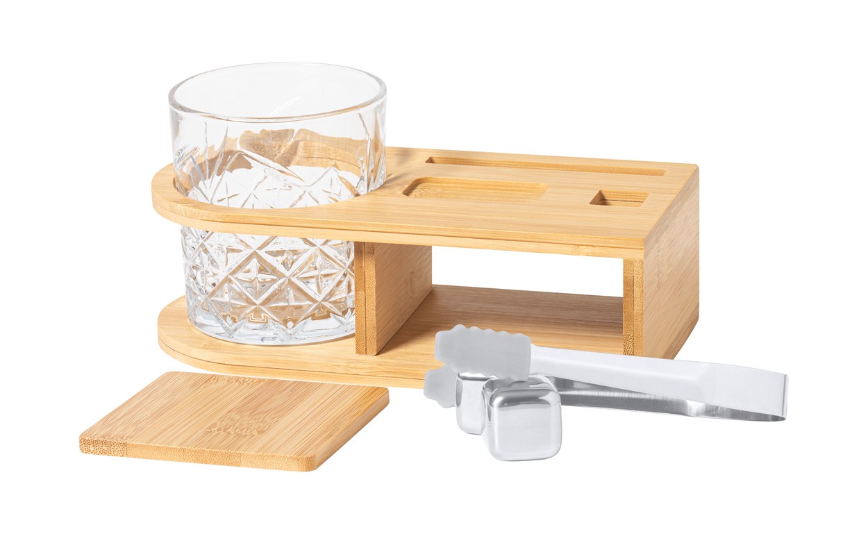 Set de whisky, cu suport de birou din bambus. Include un pahar de whisky (350 ml), 2 cuburi de gheață reutilizabile din oțel inoxidabil, clește din oțel inoxidabil și un coaster din bambus.