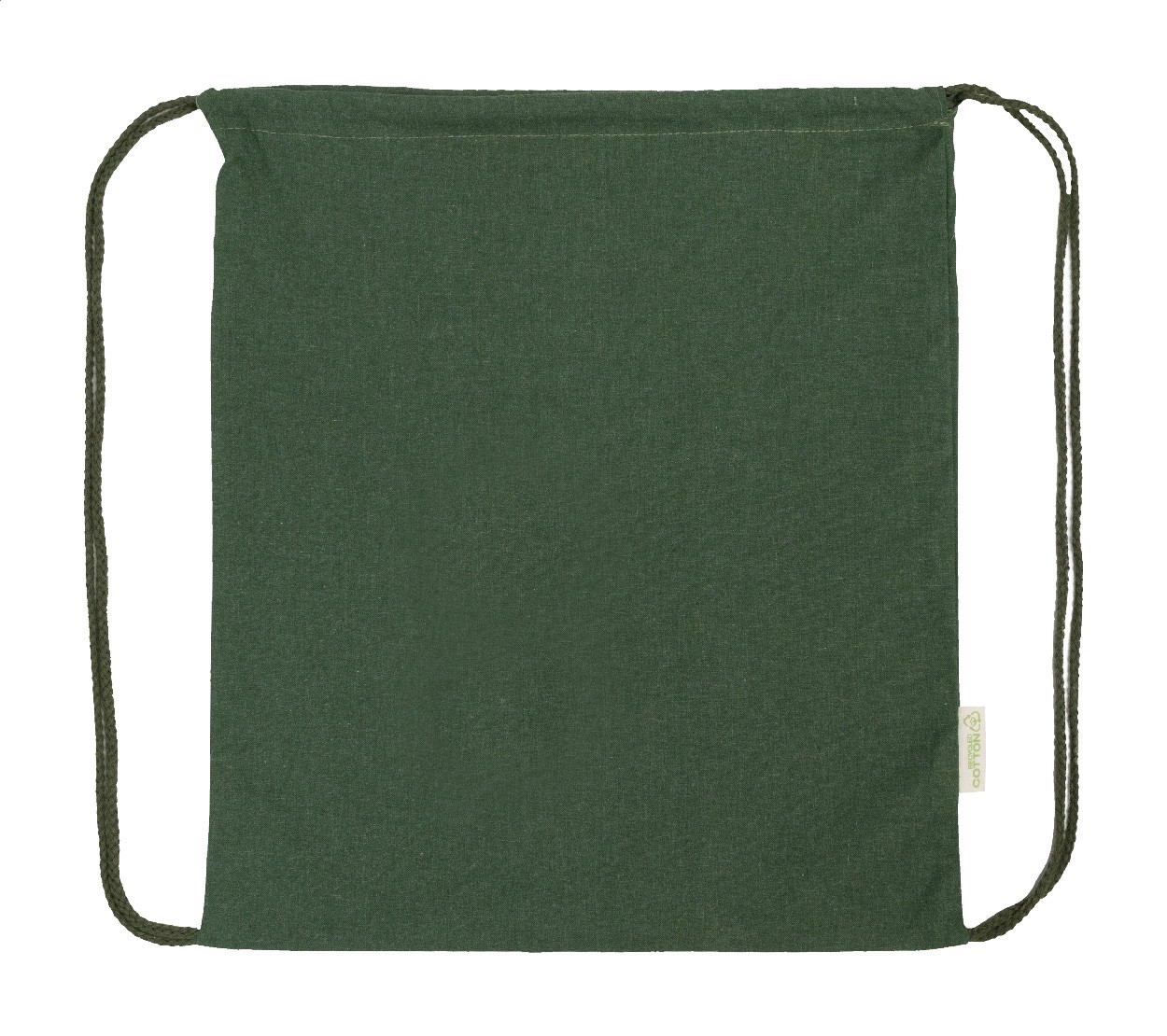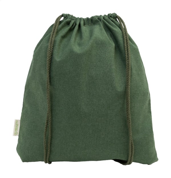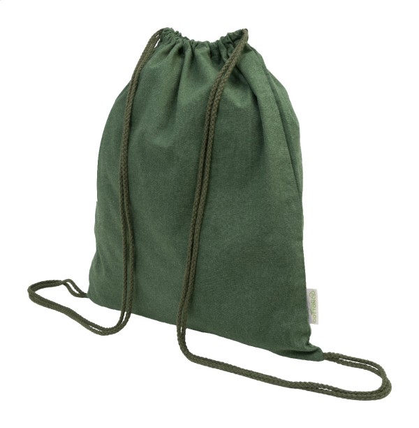Rucsac cu șnur, din 70% bumbac reciclat și 30% poliester RPET, 140 g/m². Cu etichetă distinctivă din bumbac reciclat.