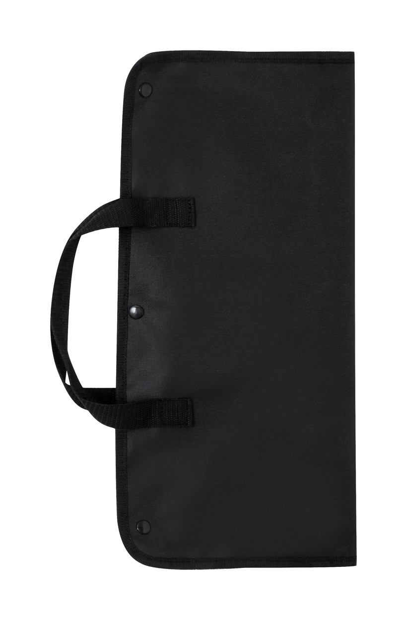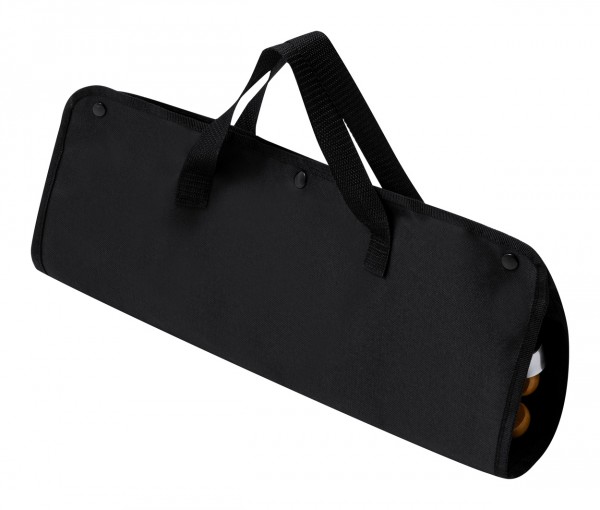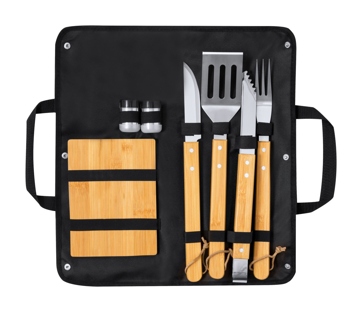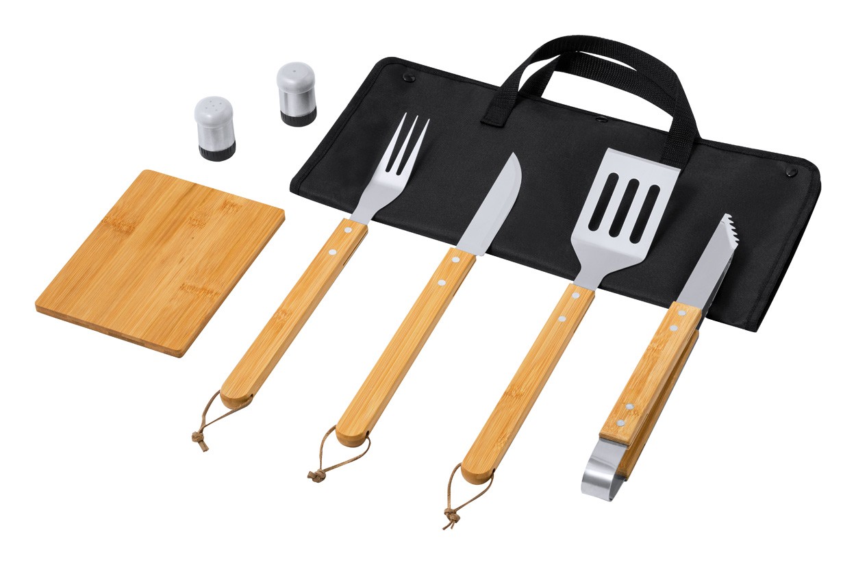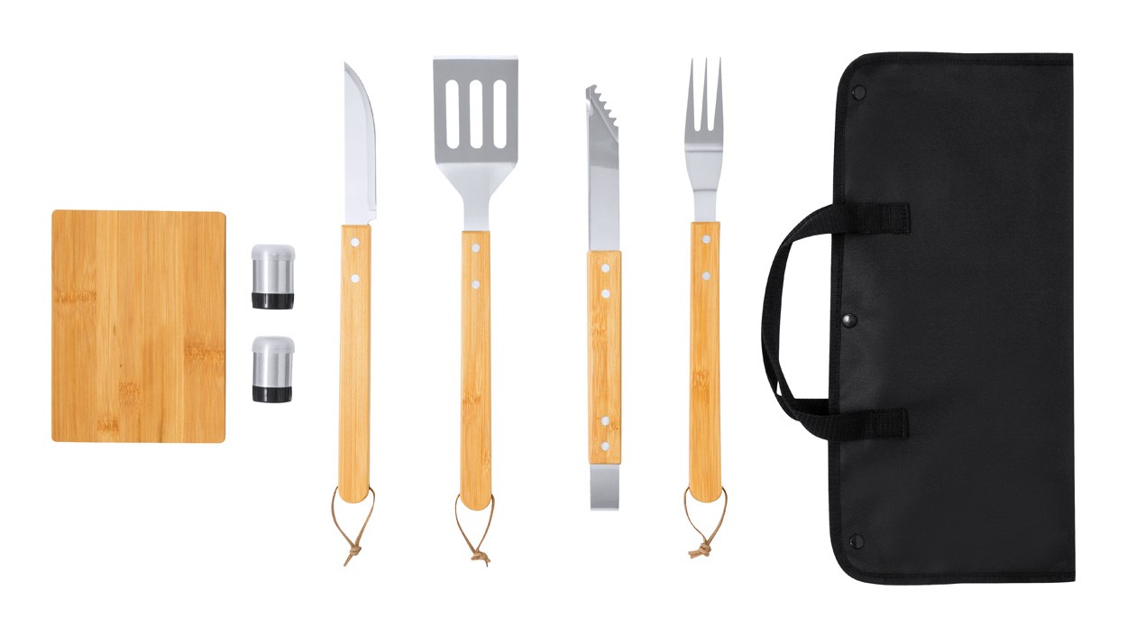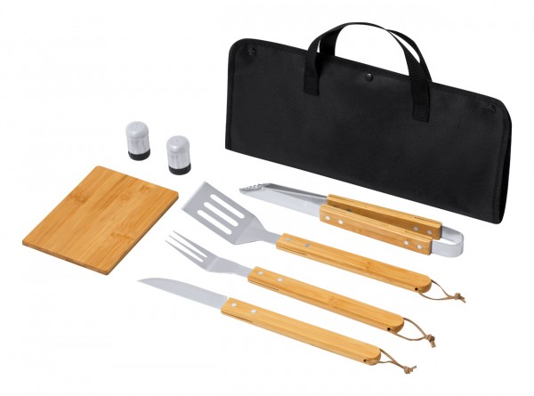 Set de 7 bucăți pentru grătar, în pungă din poliester, cu accesorii din bambus și metal. Include 1 cuțit, 1 cuțit de cioplit, 1 clește, 1 spatulă, recipiente pentru sare și piper, 1 tocător.