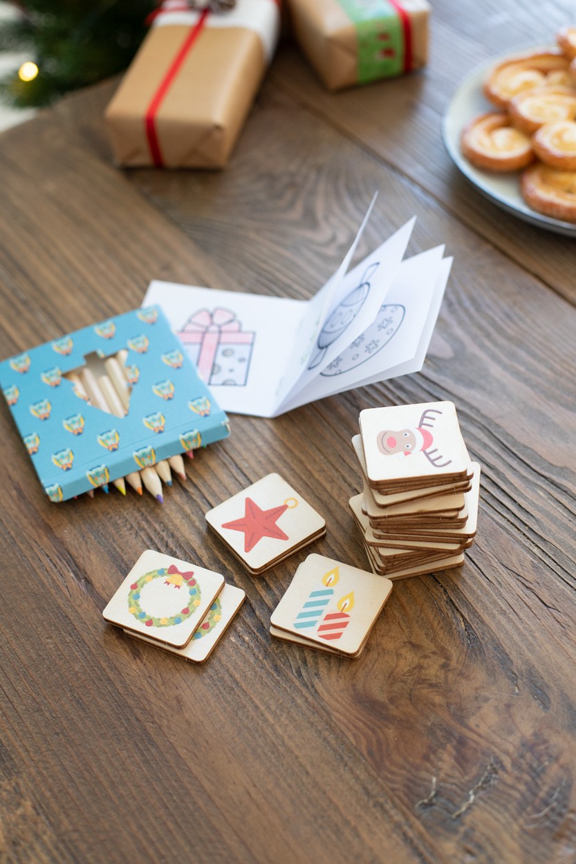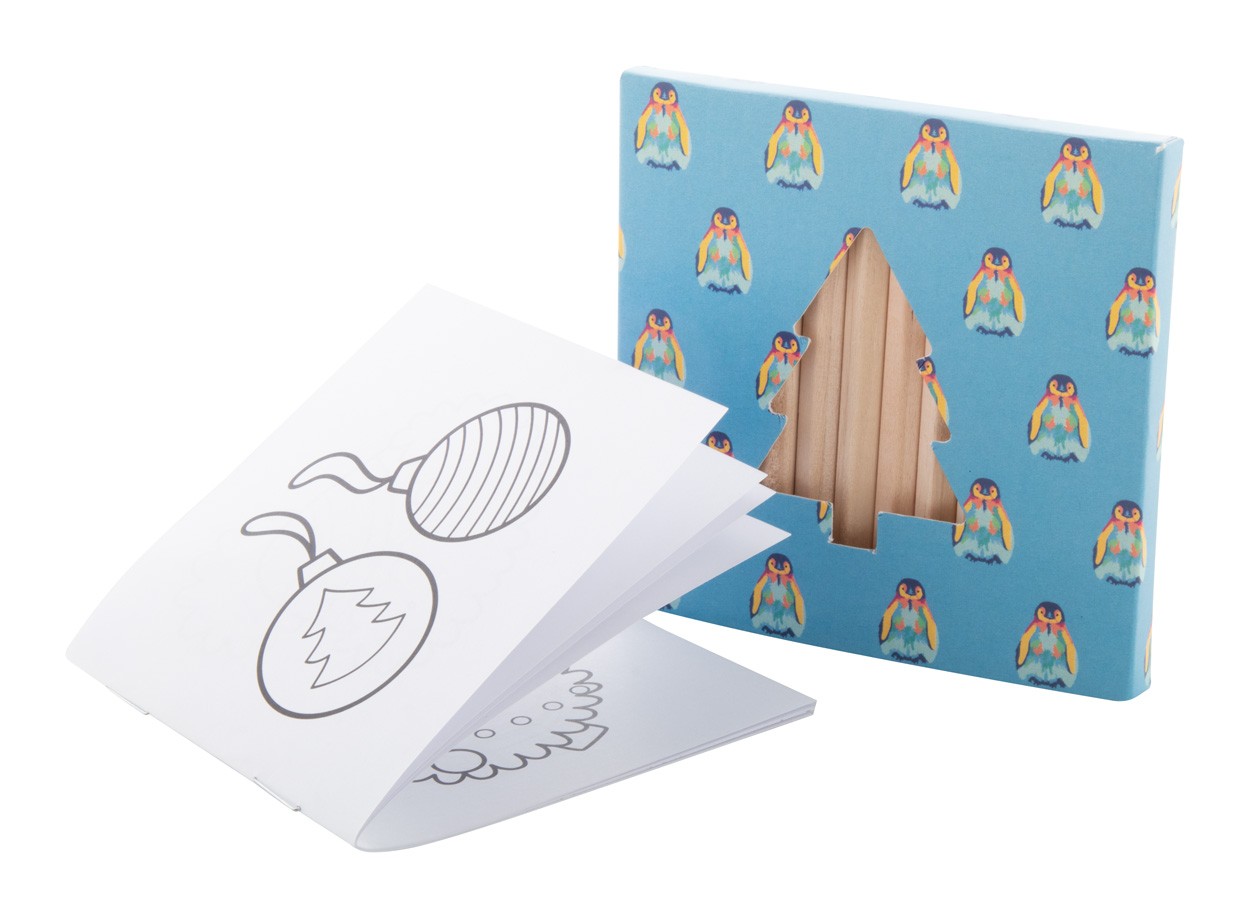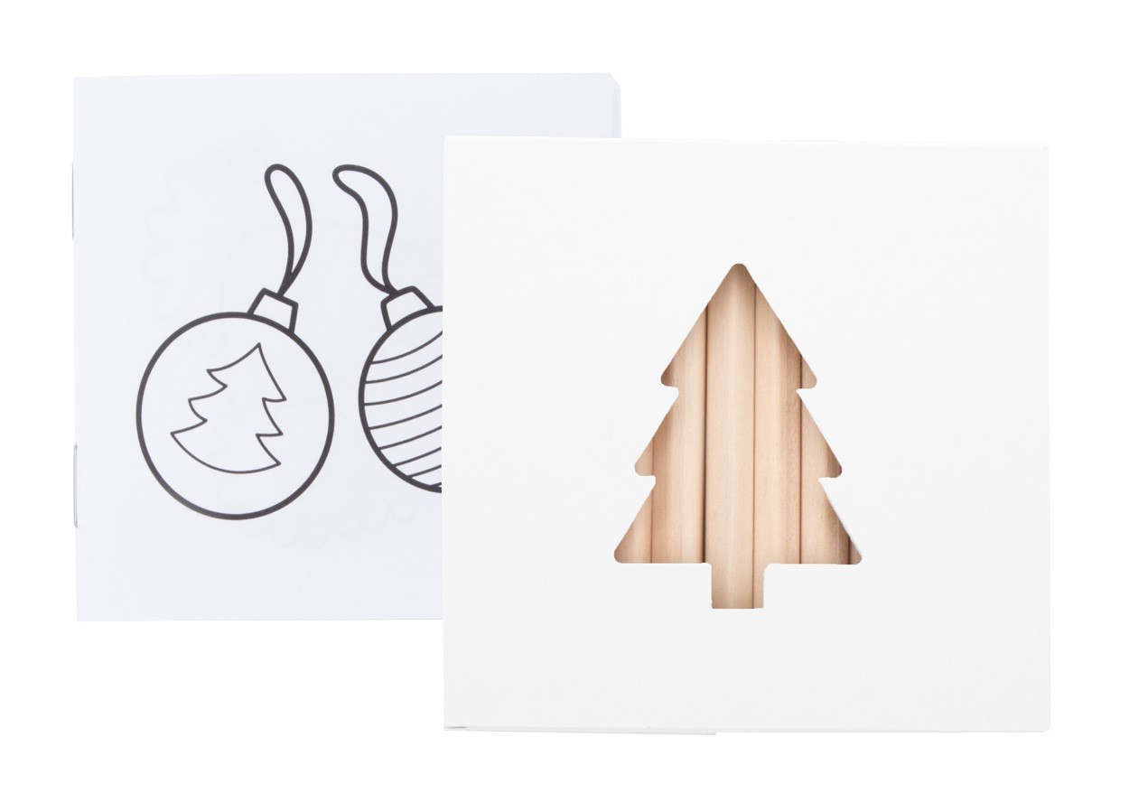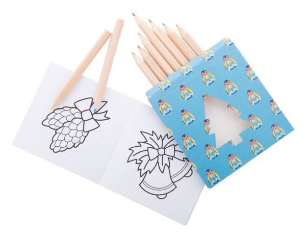 Set de colorat, de Crăciun, realizat la comandă, în cutie de hârtie imprimată color, cu brad de Crăciun tăiat. Inclusiv creioane colorate din lemn (12 buc) și carte de colorat de Crăciun. MOQ: 100 buc.