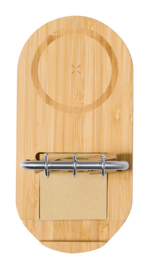 Încărcător rapid wireless multifuncțional (15W), din bambus, cu suport mobil și calendar perpetuu pe cadru metalic. Cu porturi pentru încărcător USB și USB-C. Include 50 de note adezive din hârtie kraft și cablu de încărcare USB.