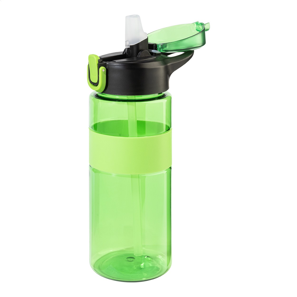 Sticlă sport RPET, cu mâner din silicon, capac cu deschidere automată și pai integrat, muștiuc din silicon și blocare de siguranță. 700 ml. Fără BPA. Nu este potrivită pentru băuturi carbogazoase.