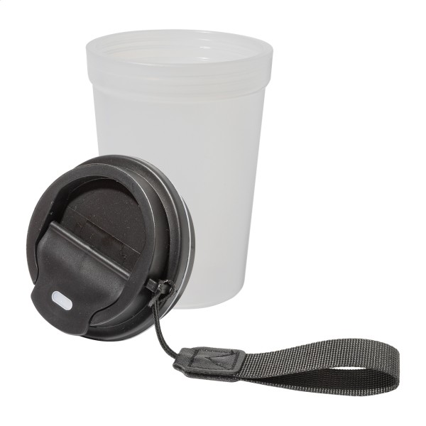 Pahar de voiaj, din plastic PP, cu finisaj mat, cu un singur perete, cu capac pentru băut și curea de transport din poliester RPET. 400 ml.