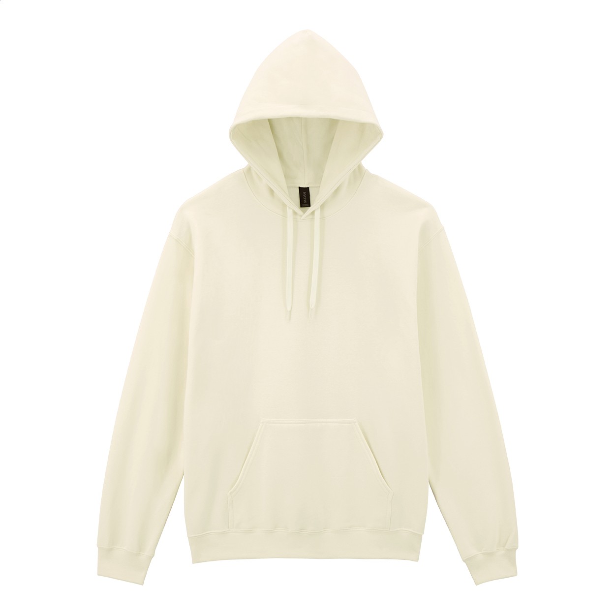 Hanorac cu glugă, din 80% bumbac și 20% poliester, cu buzunar frontal. 285 g/m² (alb 278 g/m²). Produs marca Gildan.