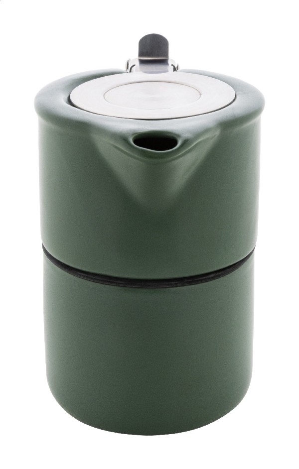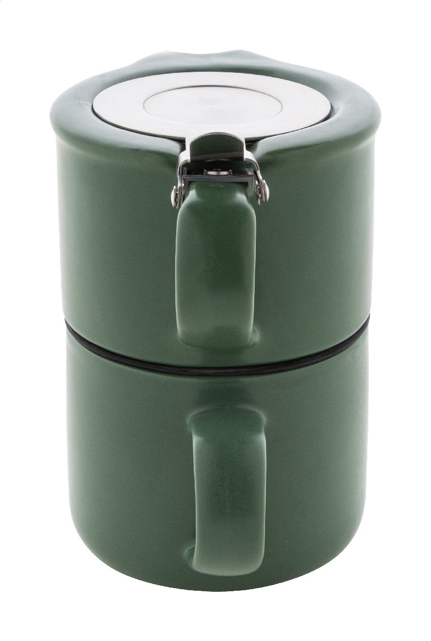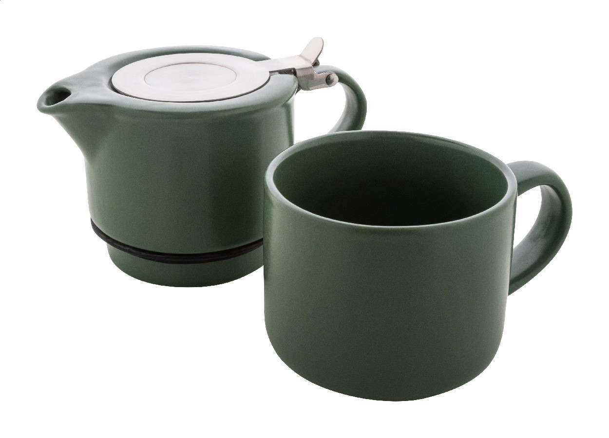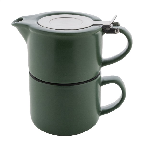 Set de ceai din ceramică de înaltă calitate, cu finisaj mat. Include un ceainic (430 ml) cu capac din oțel inoxidabil și sită pentru ceai, conceput pentru a fi stivuit perfect peste cana asortată (400 ml). Ambalat în cutie de hârtie kraft.