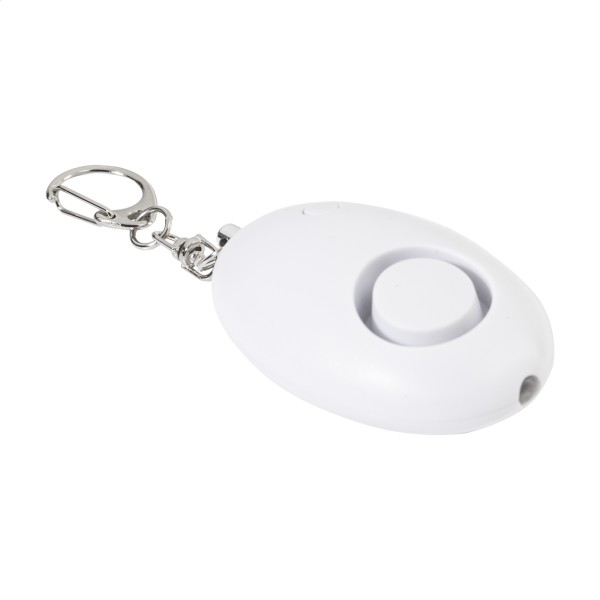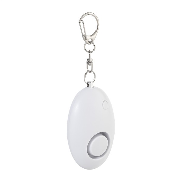 Breloc metalic tip carabină, cu alarmă personală și lanternă cu 1 LED, din ABS reciclat. Alarma se activează atunci când se trage de știft. Volumul alarmei: aprox. 100 dB. Cu baterii tip pastilă.