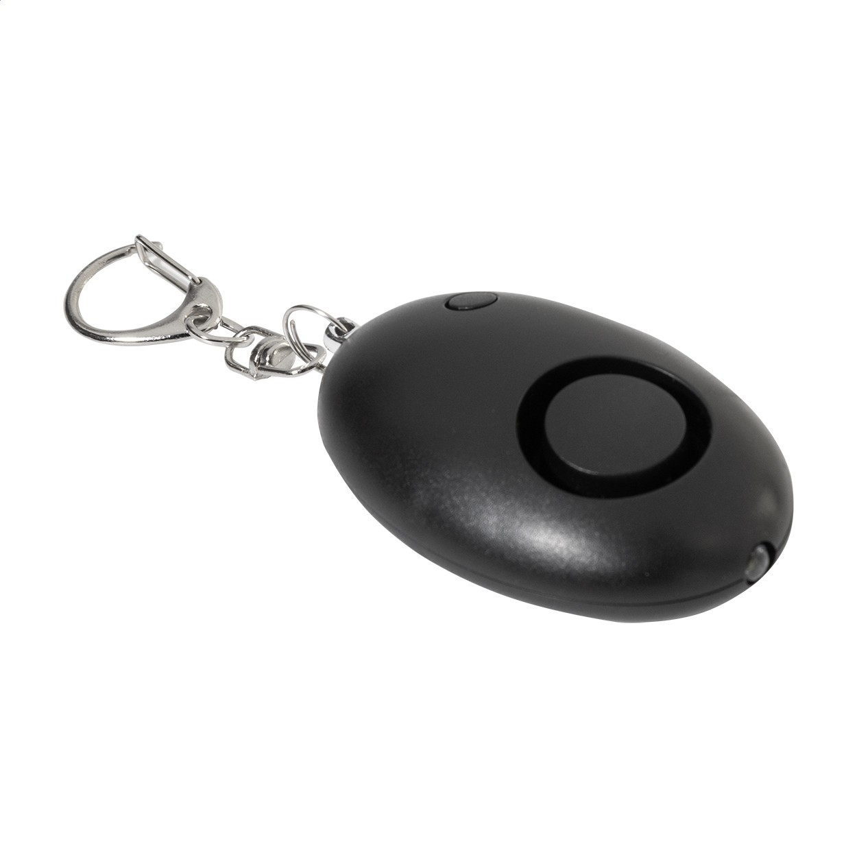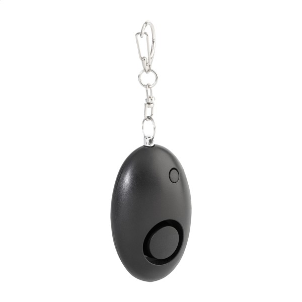 Breloc metalic tip carabină, cu alarmă personală și lanternă cu 1 LED, din ABS reciclat. Alarma se activează atunci când se trage de știft. Volumul alarmei: aprox. 100 dB. Cu baterii tip pastilă.
