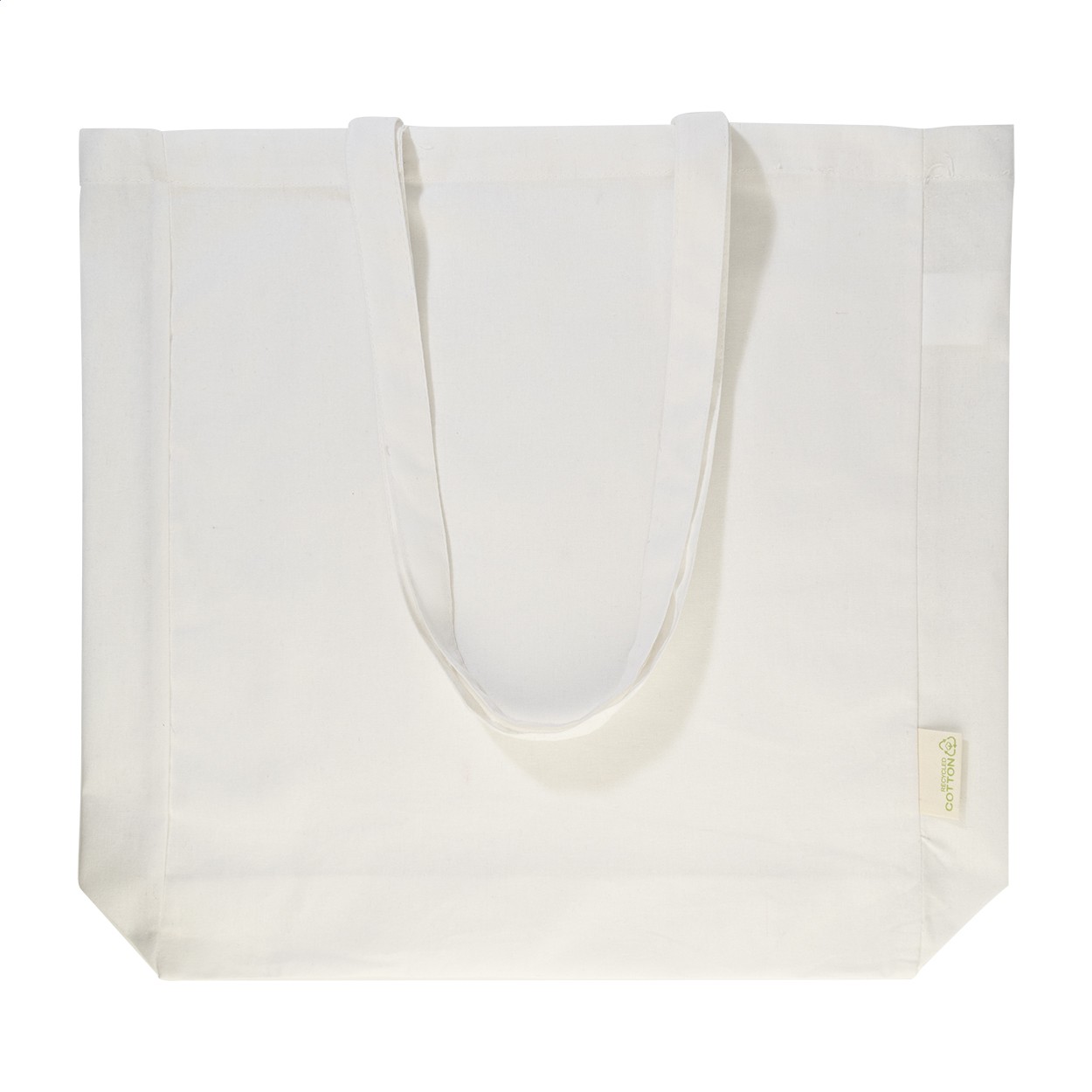 Sacoșă de cumpărături, cu pliu și mânere lungi, din 70% bumbac reciclat și 30% poliester RPET, 140 g/m². Cu etichetă distinctivă din bumbac reciclat.