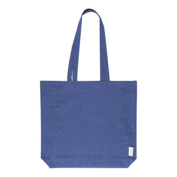 Sacoșă de cumpărături, cu pliu și mânere lungi, din 70% bumbac reciclat și 30% poliester RPET, 140 g/m². Cu etichetă distinctivă din bumbac reciclat.