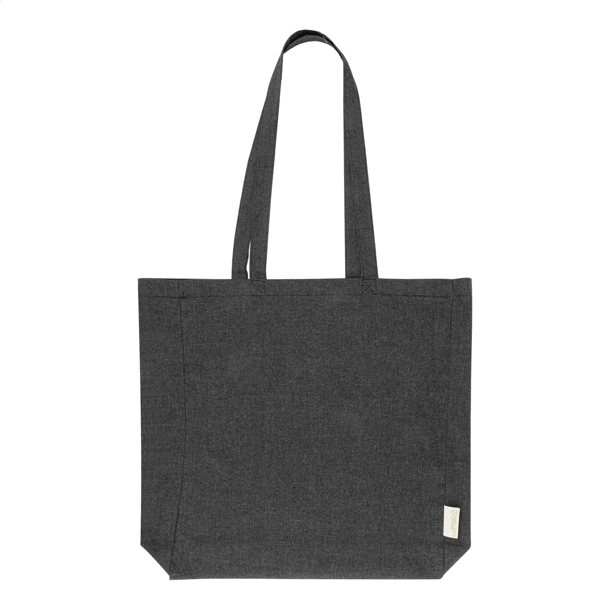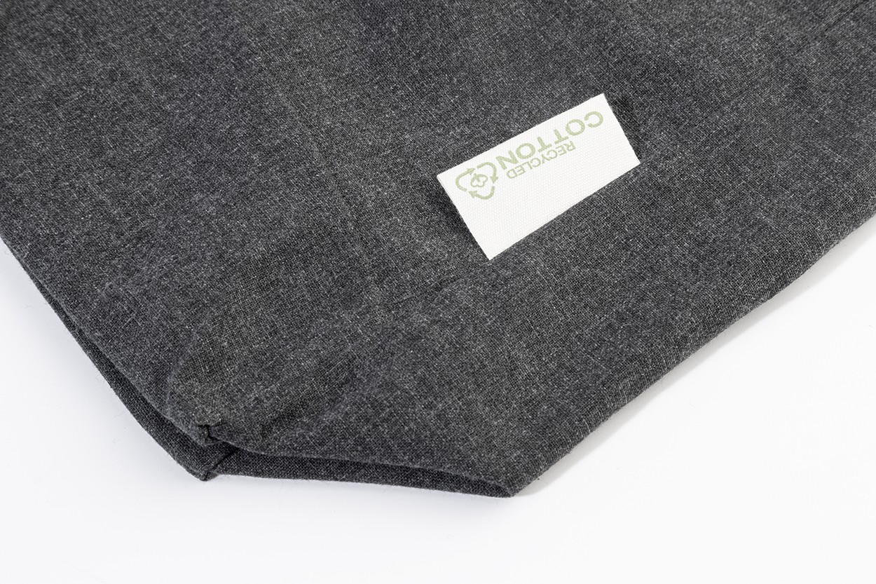 Sacoșă de cumpărături, cu pliu și mânere lungi, din 70% bumbac reciclat și 30% poliester RPET, 140 g/m². Cu etichetă distinctivă din bumbac reciclat.