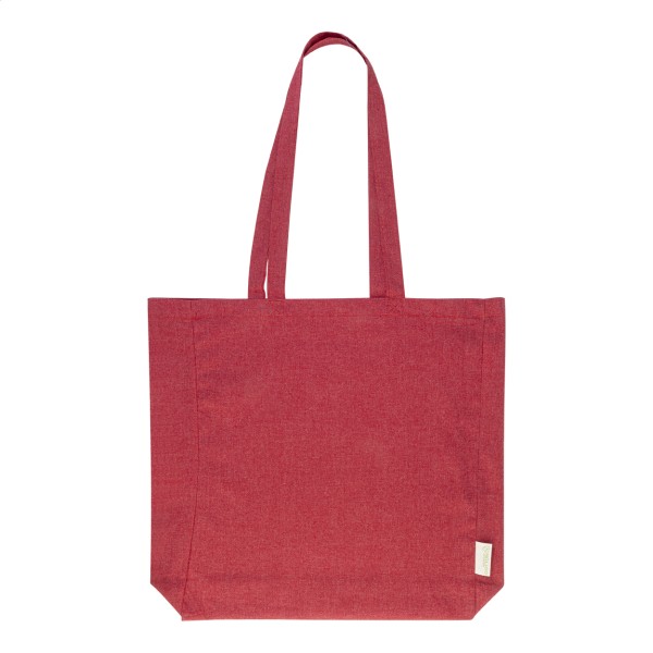 Sacoșă de cumpărături, cu pliu și mânere lungi, din 70% bumbac reciclat și 30% poliester RPET, 140 g/m². Cu etichetă distinctivă din bumbac reciclat.