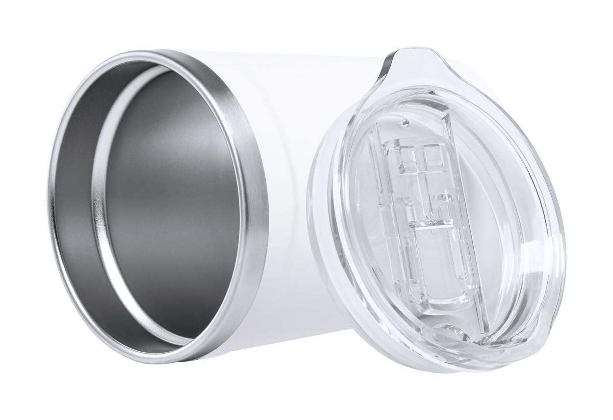Cană termică din oțel inoxidabil, cu perete dublu, cu capac transparent pentru băut, din plastic PP. 350 ml. Izolația menține băuturile calde timp de 2 ore și reci timp de 4 ore.