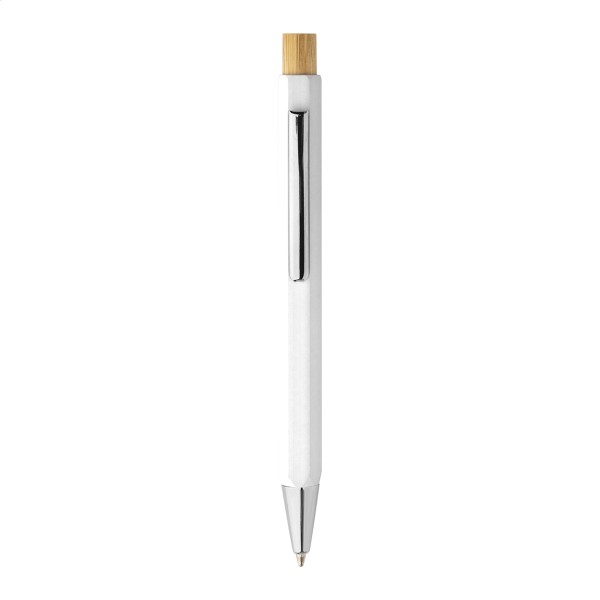Pix hexagonal, din aluminiu reciclat, cu buton din bambus și piese cromate. Cu mină albastră.